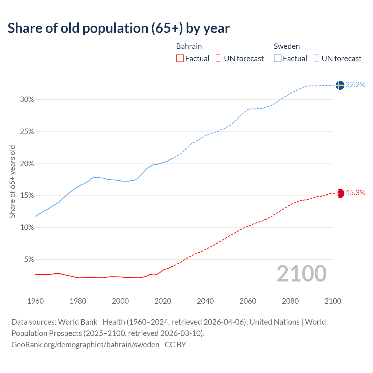 The share of older people aged 65 and over is 3.85% in Bahrain and 20.7% in Sweden. Life expectancy in Bahrain compared to Sweden .
