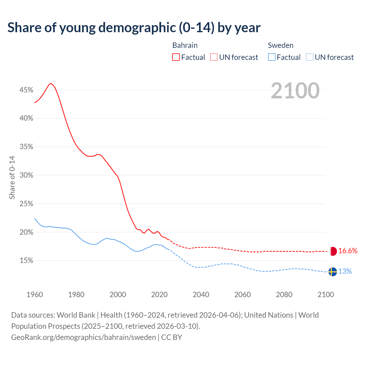 - The share of young demographic (0-15 years old) in Bahrain is 18.7% vs 17% in Sweden.