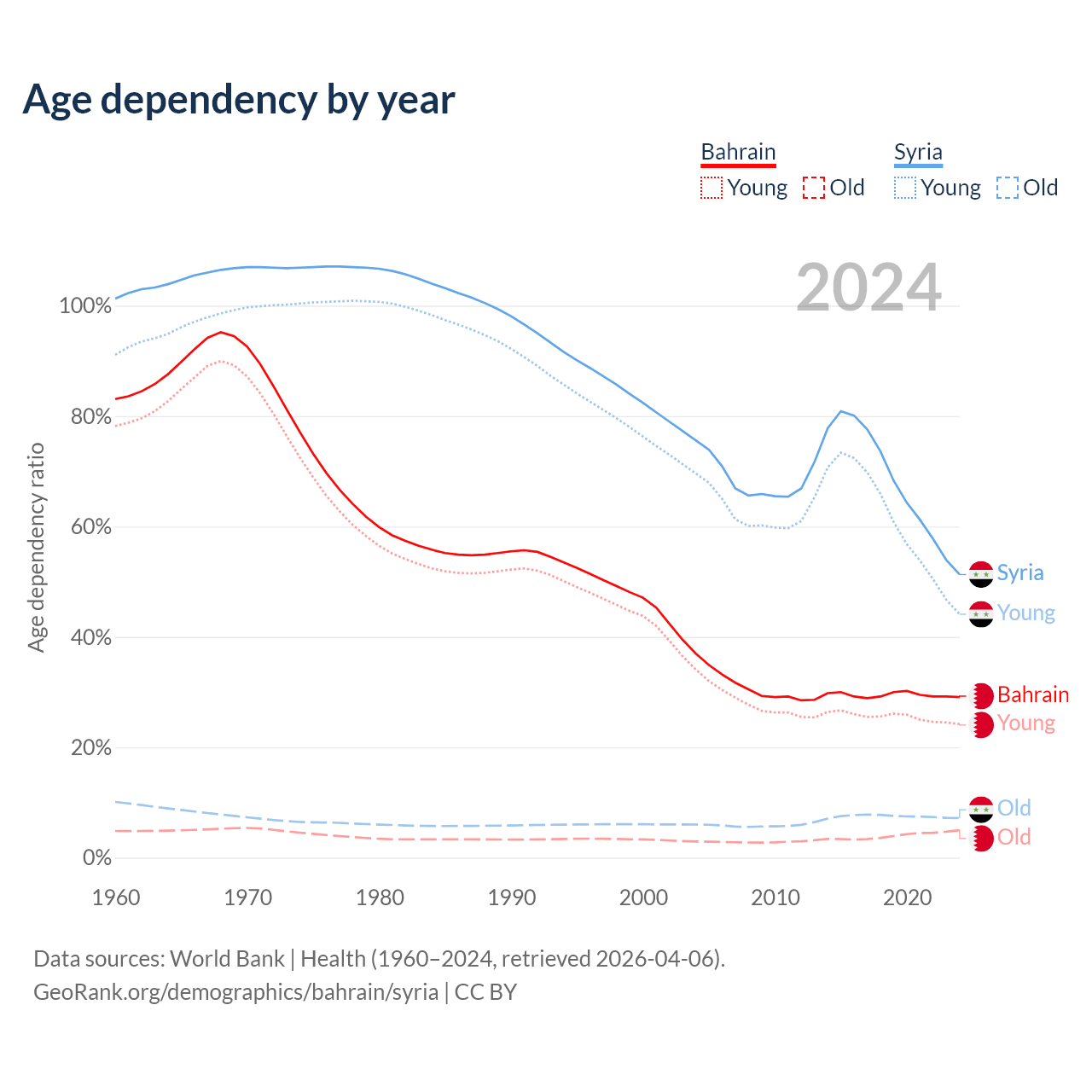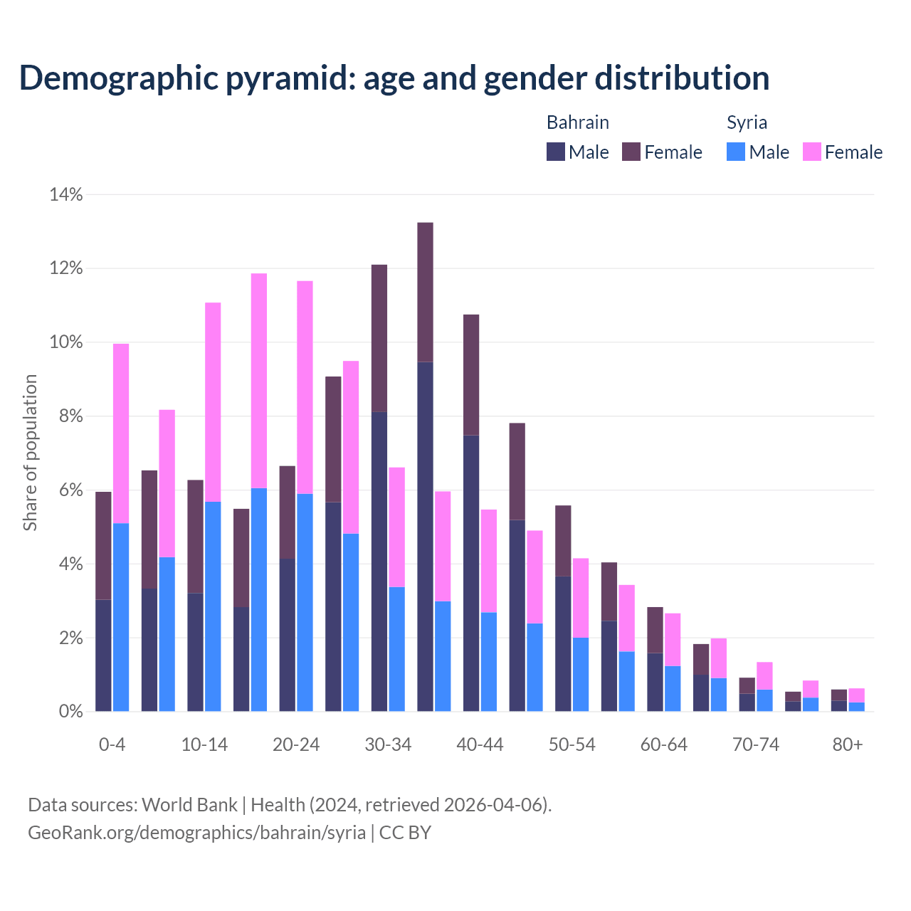 - Bahrain is ranked 80/196 by median age (oldest to youngest) vs 138/196 for Syria.