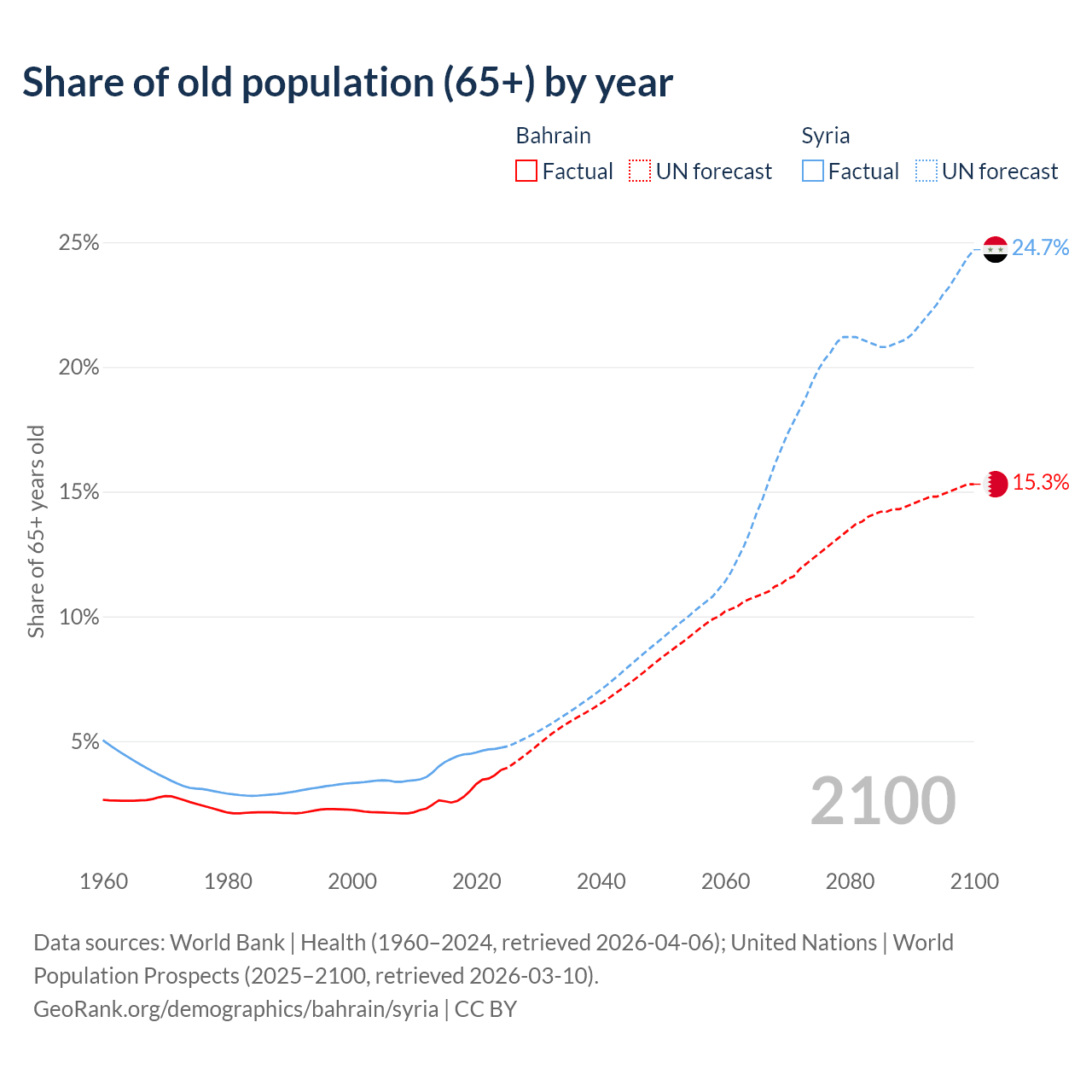 - The share of old-age demographic (65+) in Bahrain is 3.85% vs 4.74% in Syria.
