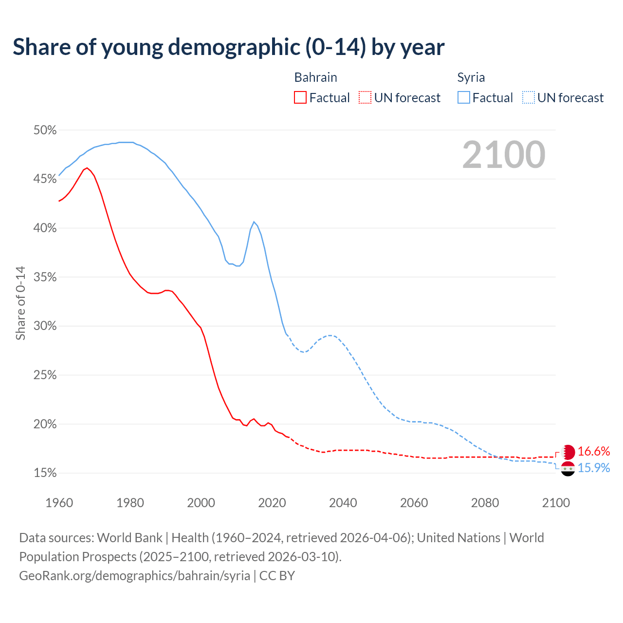 - The share of young demographic (0-15 years old) in Bahrain is 18.7% vs 29.2% in Syria.