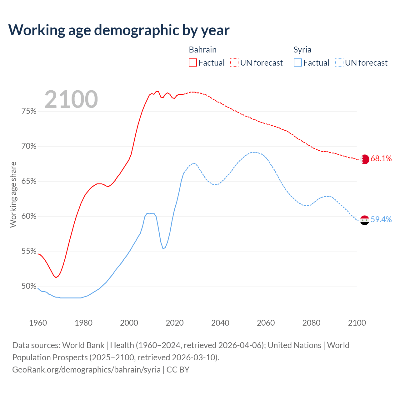 - Bahrain has 1.29M working age adults (aged 15-64) vs 17.7M in Syria.