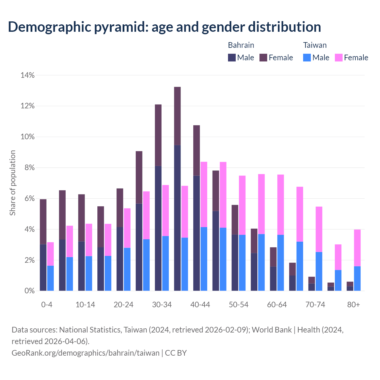 - Bahrain is ranked 80/196 by median age (oldest to youngest) vs 16/196 for Taiwan.