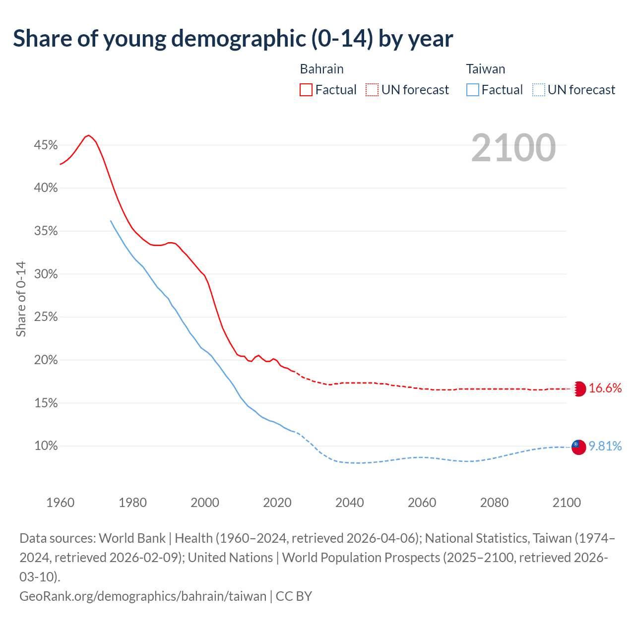 - The share of young demographic (0-15 years old) in Bahrain is 18.7% vs 11.7% in Taiwan.