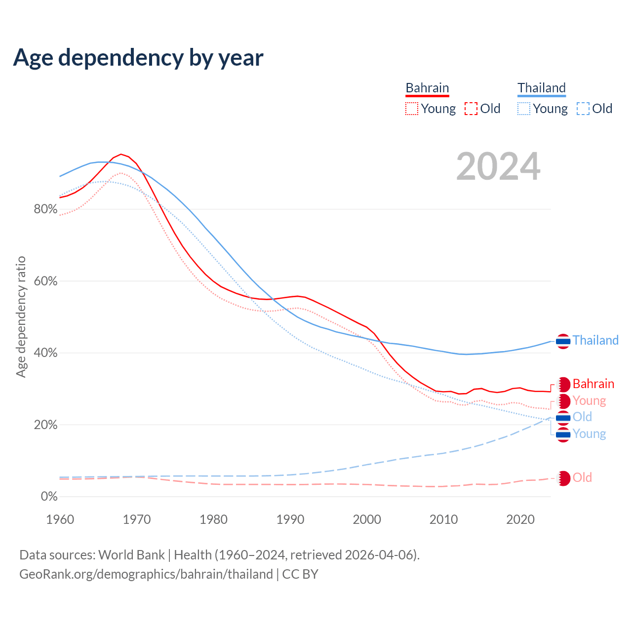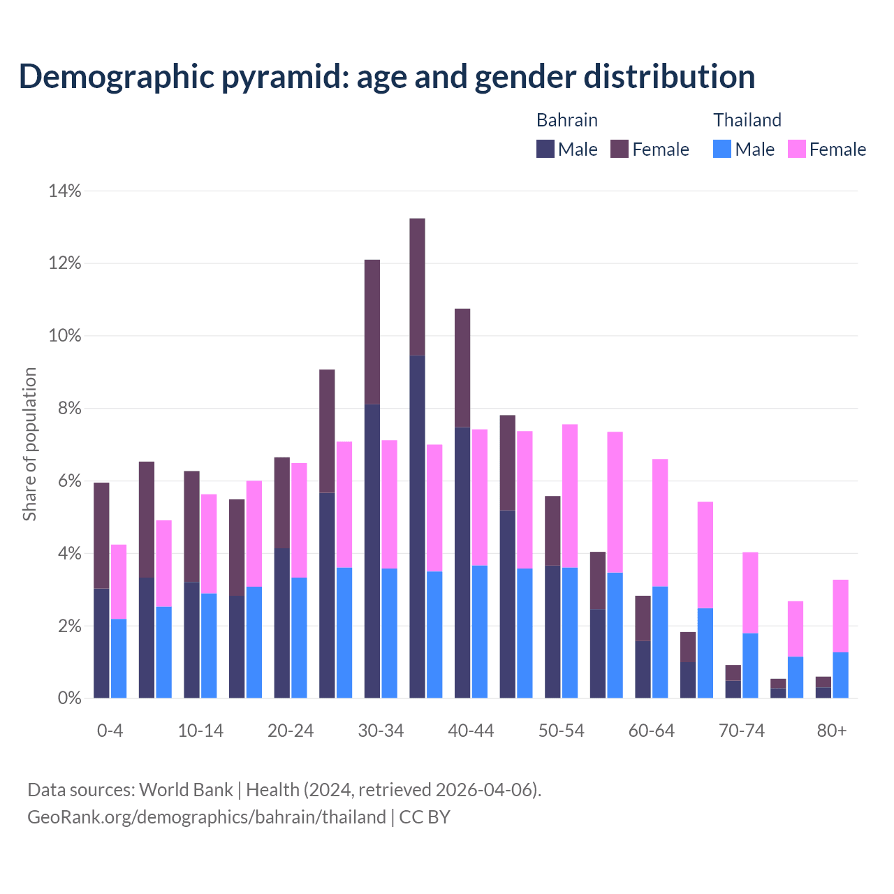 - Bahrain is ranked 80/196 by median age (oldest to youngest) vs 40/196 for Thailand.