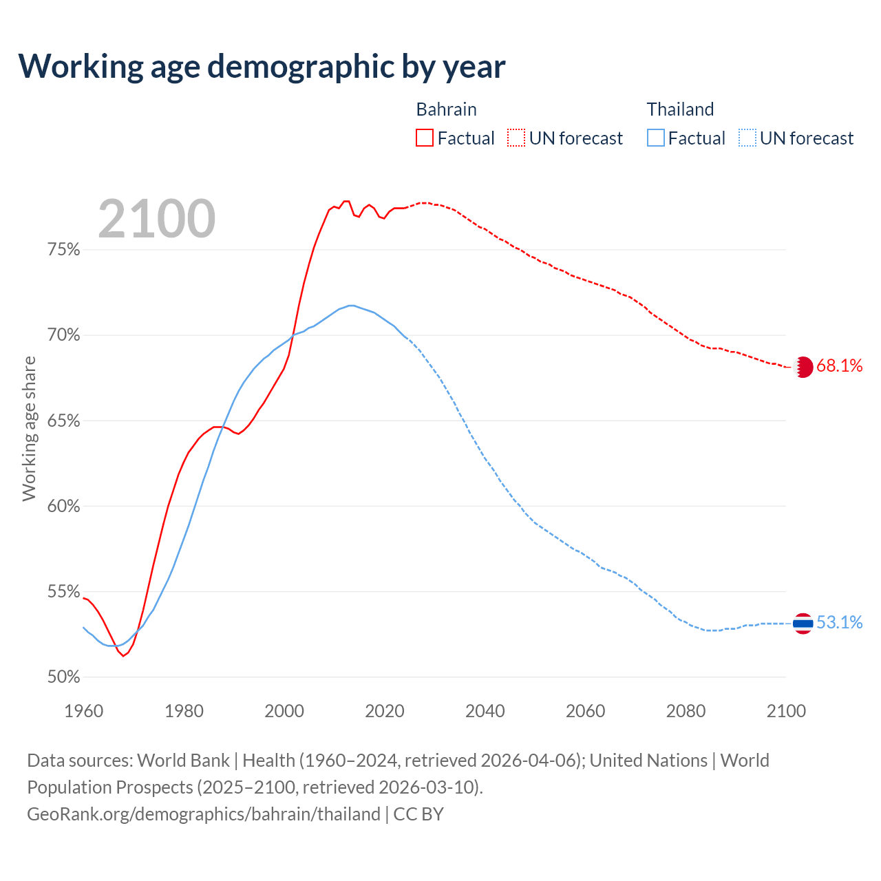 Median age Bahrain vs Thailand, 1960-2100