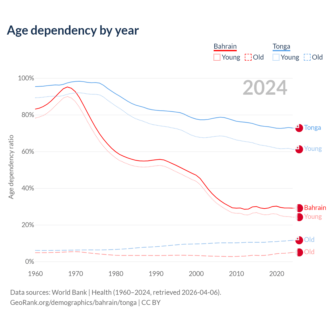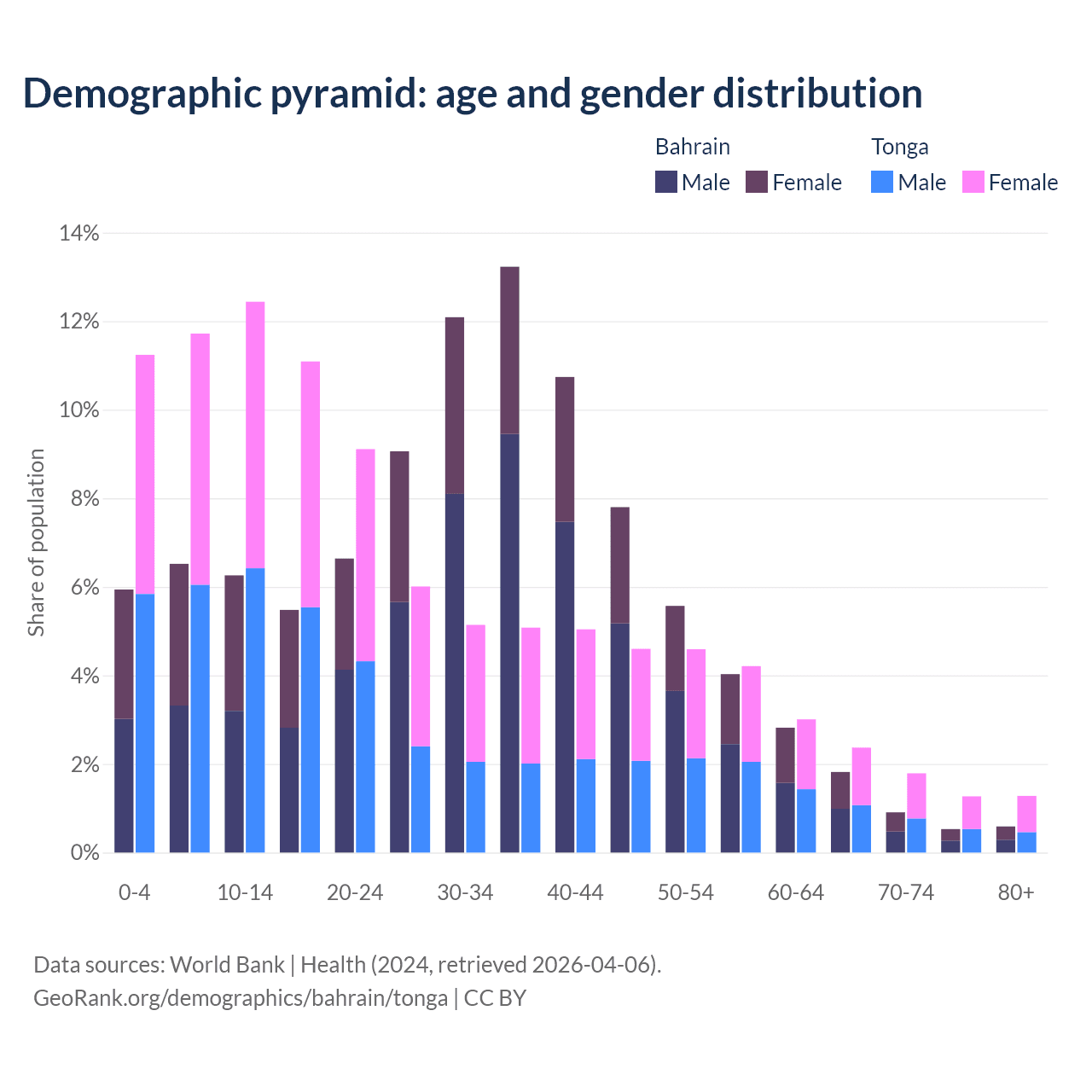 - Bahrain is ranked 80/196 by median age (oldest to youngest) vs 149/196 for Tonga.