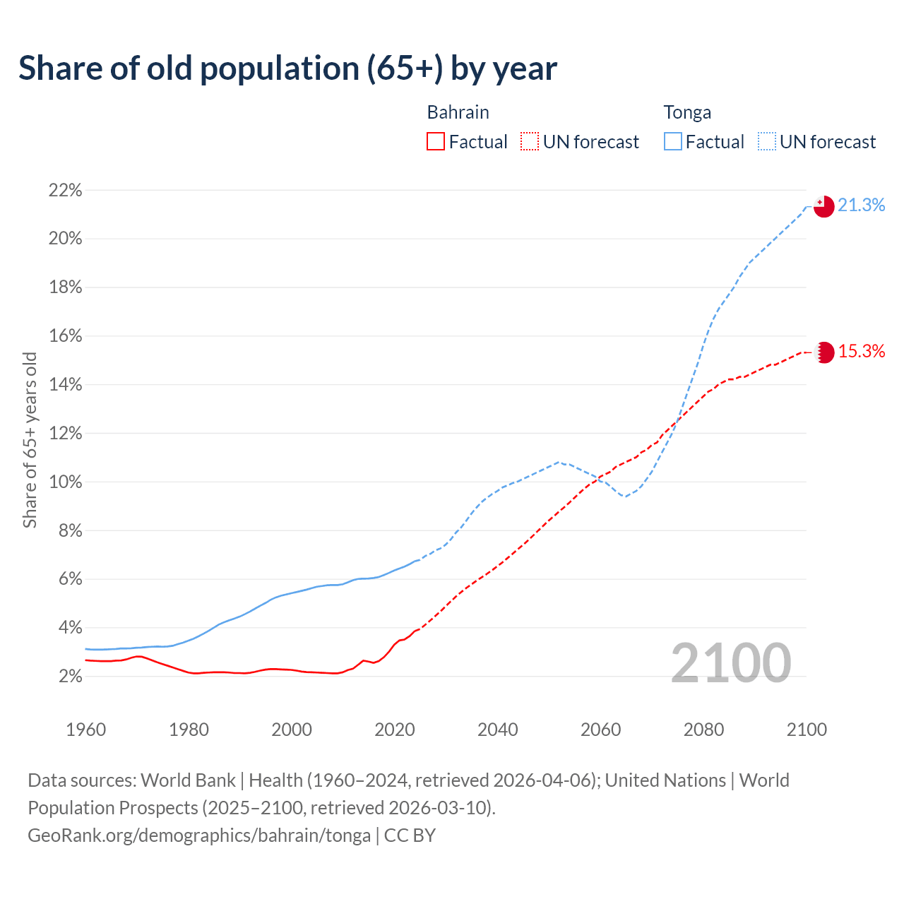 The share of older people aged 65 and over is 3.85% in Bahrain and 6.72% in Tonga. Life expectancy in Bahrain compared to Tonga .