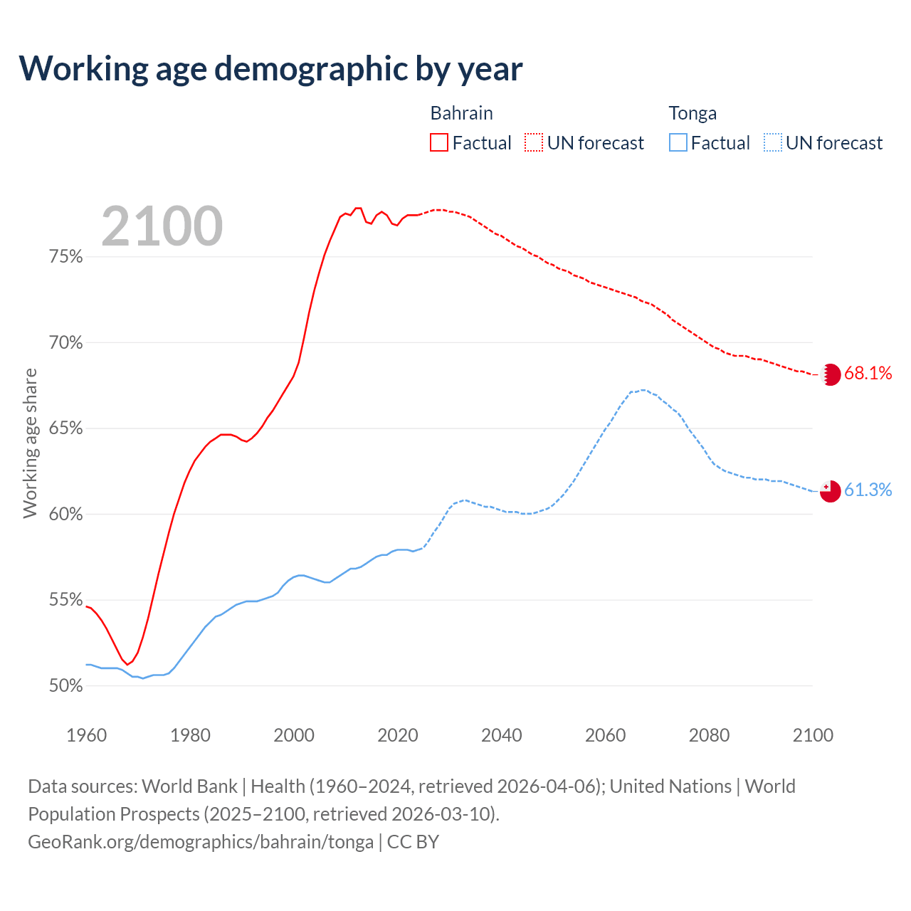 - Bahrain has 1.29M working age adults (aged 15-64) vs 59.8K in Tonga.