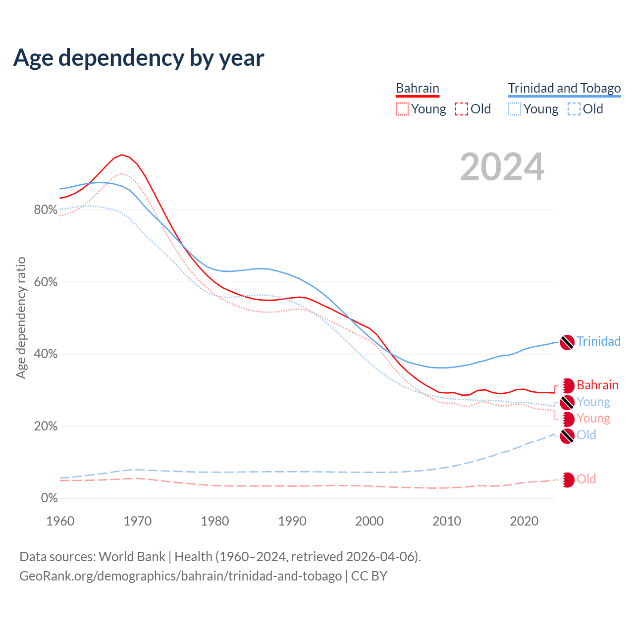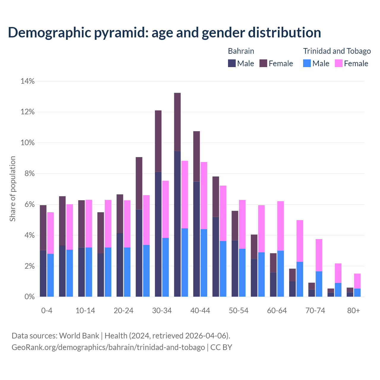 - Bahrain is ranked 80/196 by median age (oldest to youngest) vs 58/196 for Trinidad and Tobago.