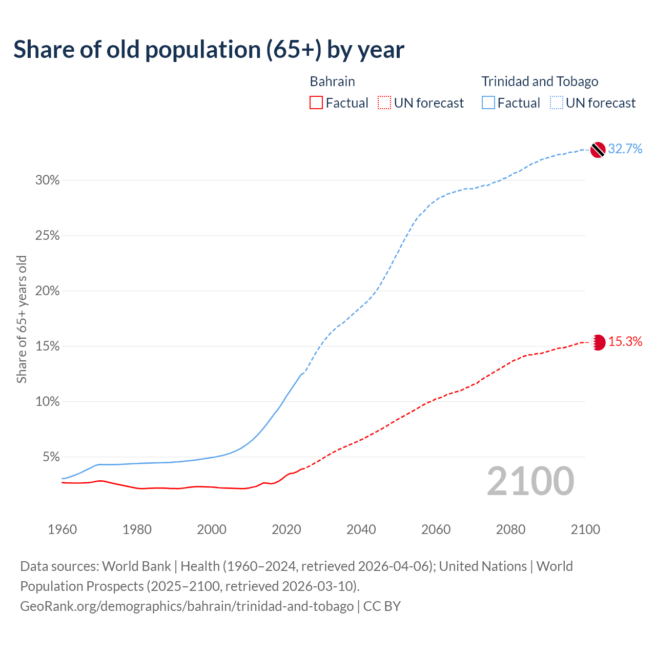 The share of older people aged 65 and over is 3.85% in Bahrain and 12.4% in Trinidad and Tobago. Life expectancy in Bahrain compared to Trinidad and Tobago .