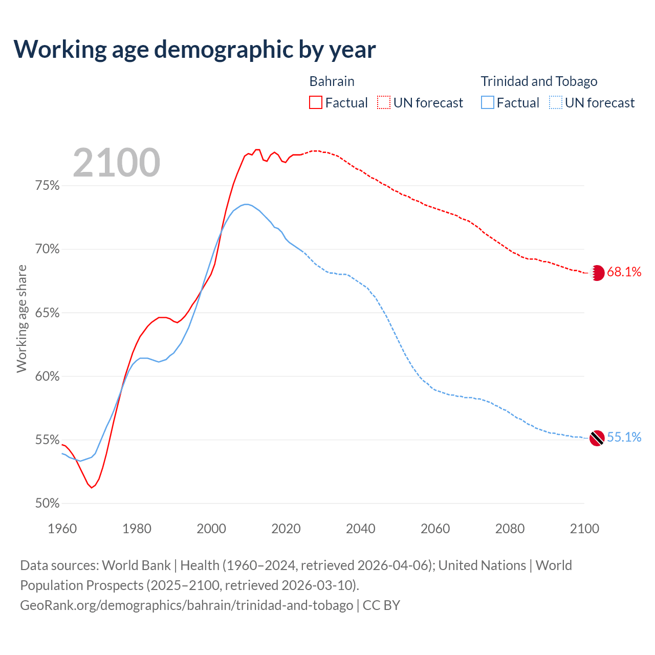 Median age Bahrain vs Trinidad and Tobago, 1960-2100