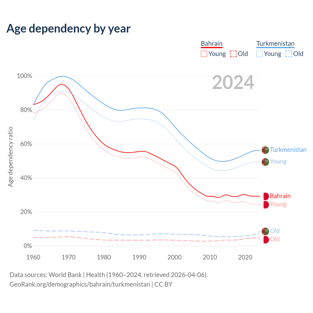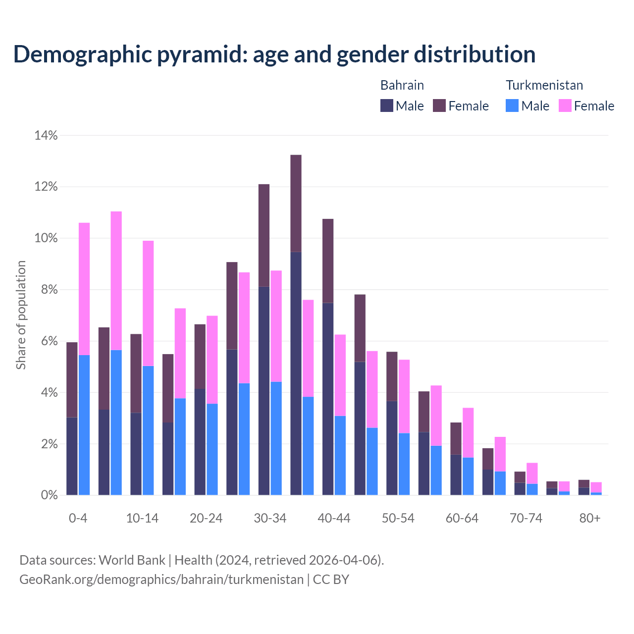- Bahrain is ranked 80/196 by median age (oldest to youngest) vs 119/196 for Turkmenistan.