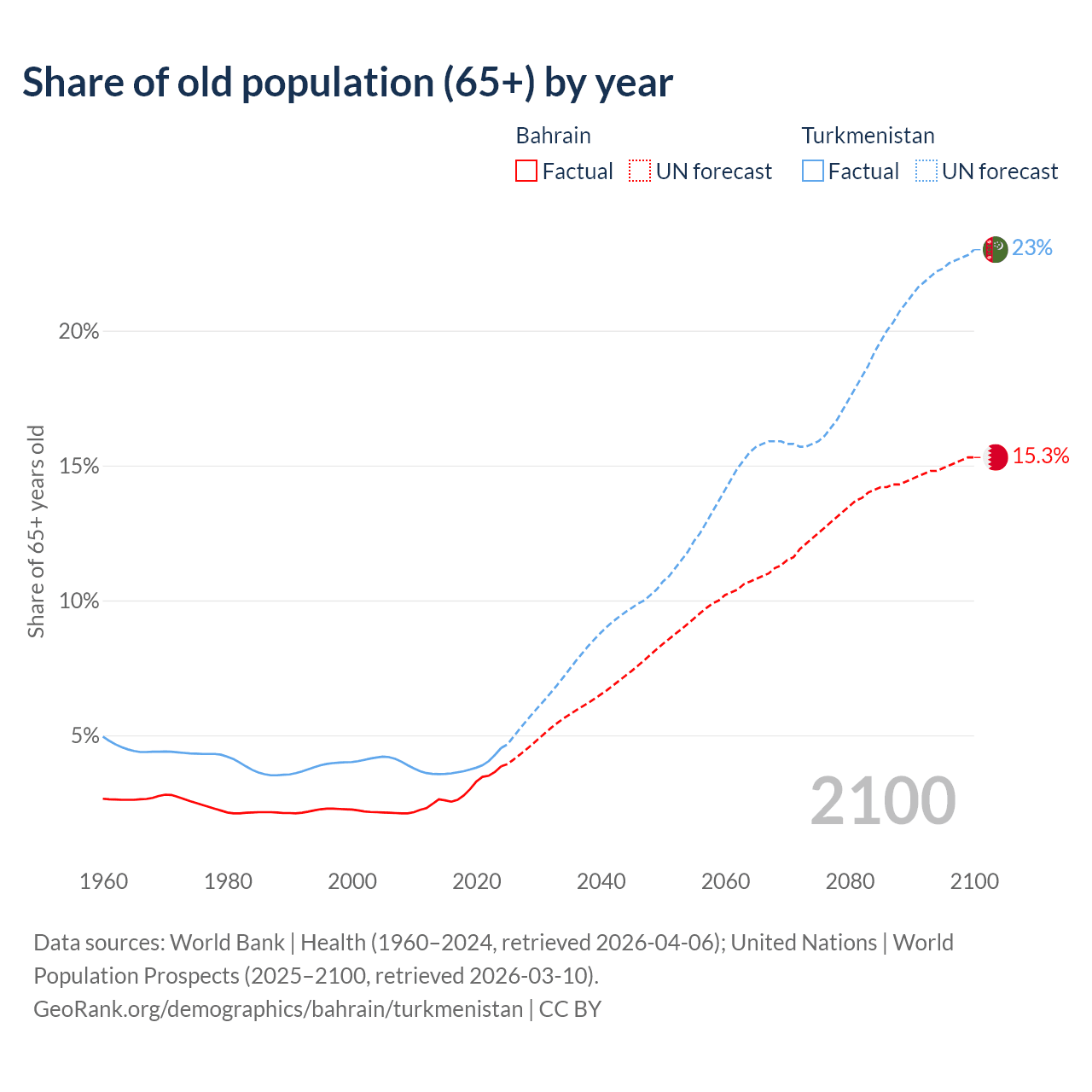The share of older people aged 65 and over is 3.85% in Bahrain and 4.53% in Turkmenistan. Life expectancy in Bahrain compared to Turkmenistan .