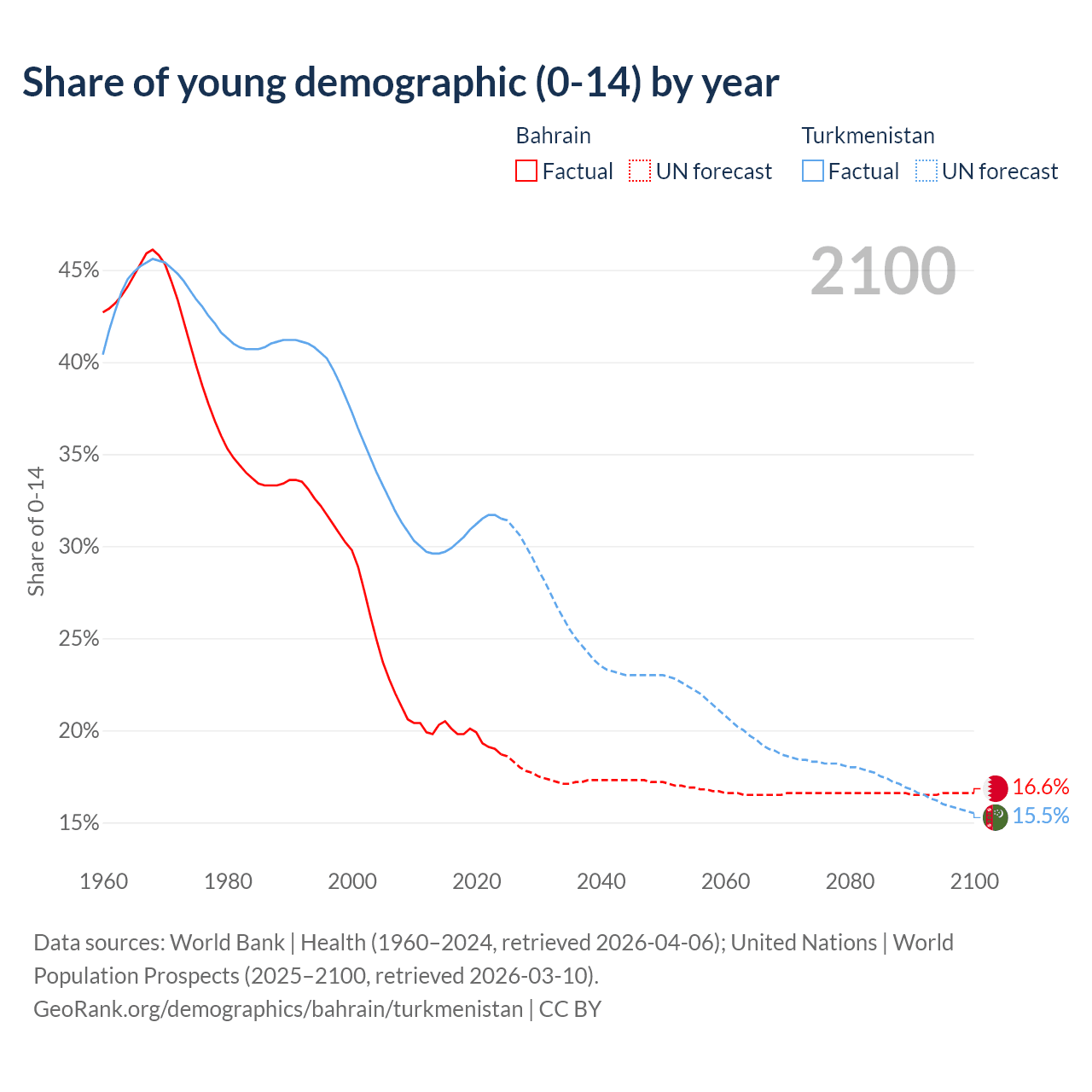 - The share of young demographic (0-15 years old) in Bahrain is 18.7% vs 31.5% in Turkmenistan.