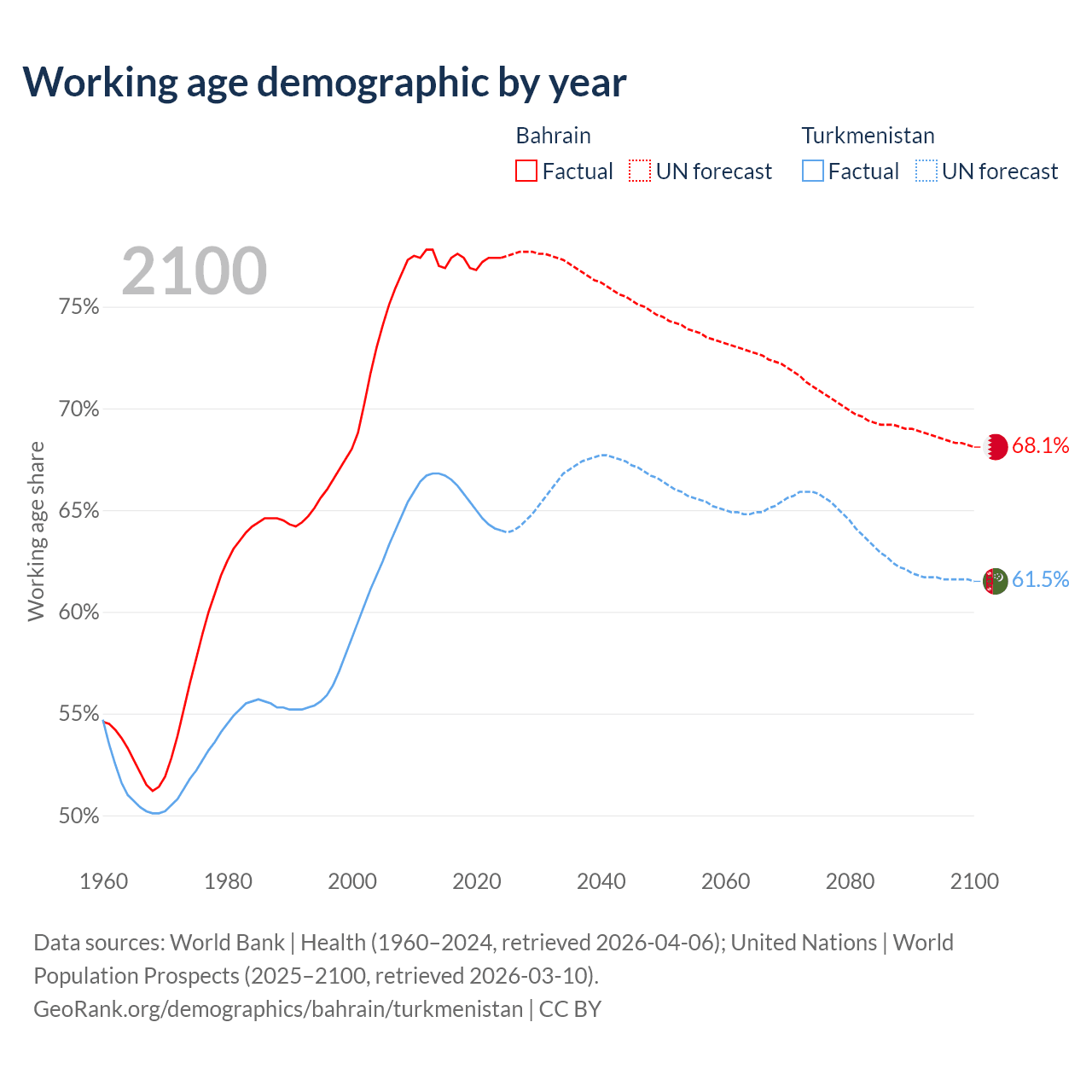 - Bahrain has 1.29M working age adults (aged 15-64) vs 4.97M in Turkmenistan.