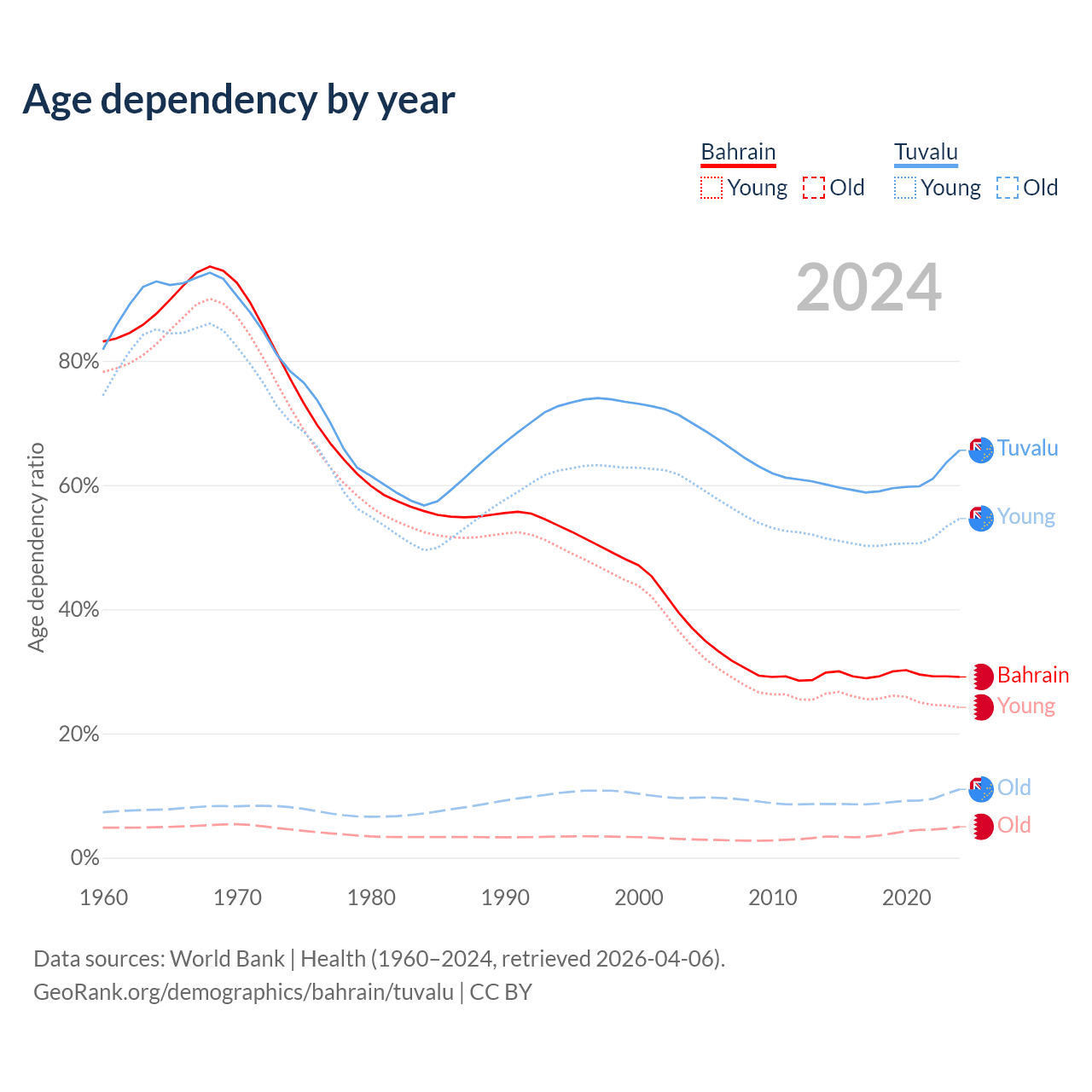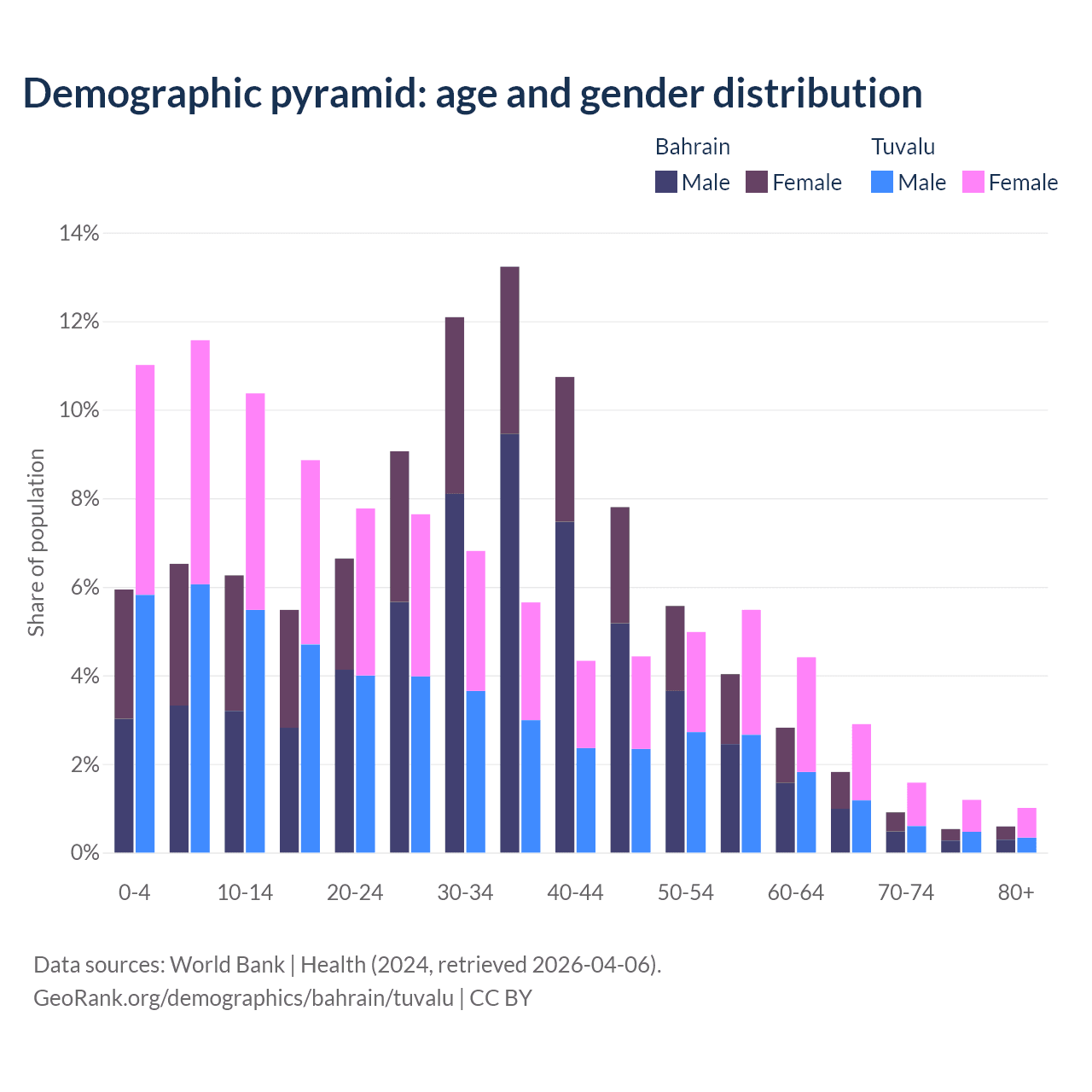 - Bahrain is ranked 80/196 by median age (oldest to youngest) vs 132/196 for Tuvalu.