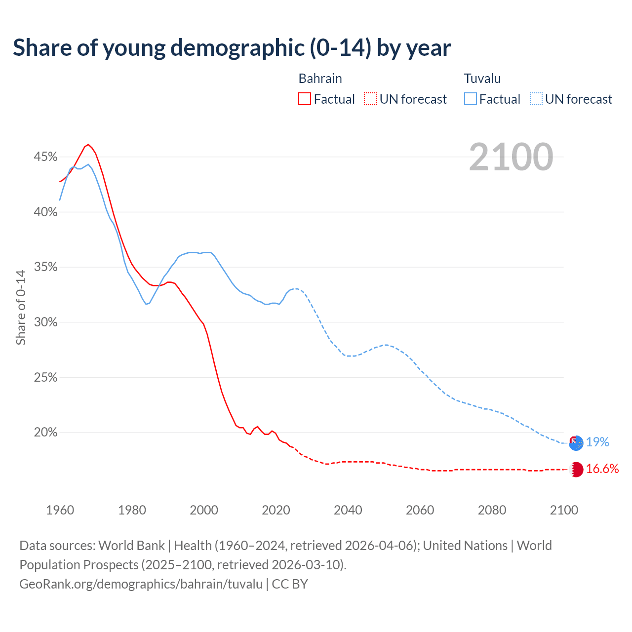 - The share of young demographic (0-15 years old) in Bahrain is 18.7% vs 32.9% in Tuvalu.