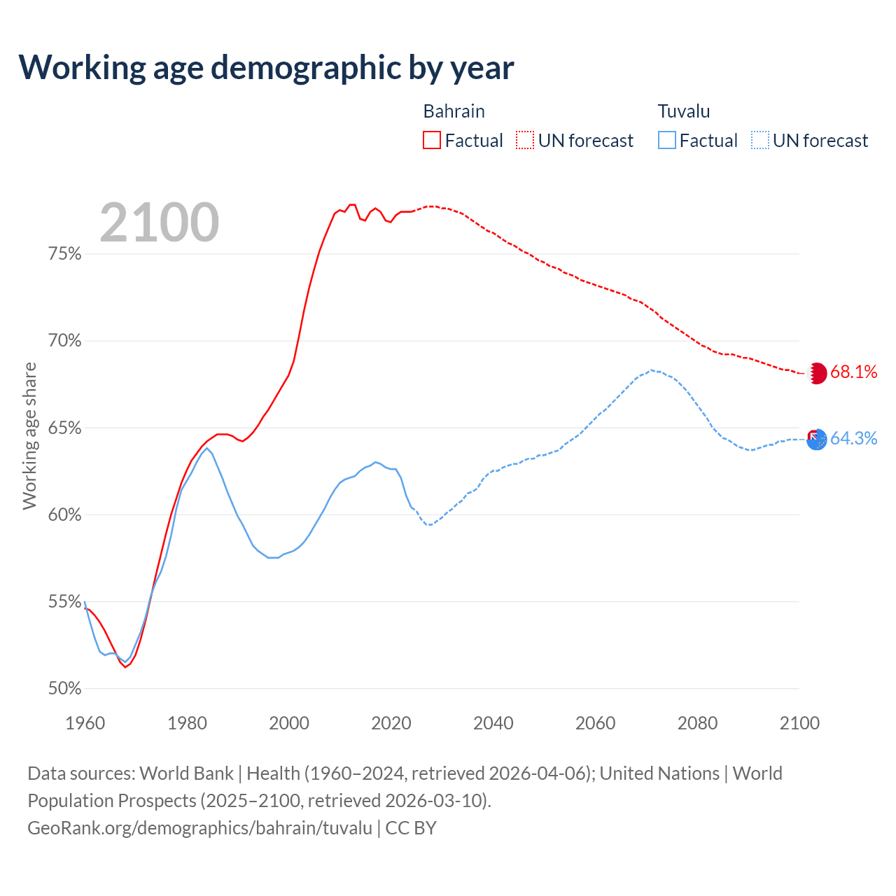 - Bahrain has 1.29M working age adults (aged 15-64) vs 5.64K in Tuvalu.