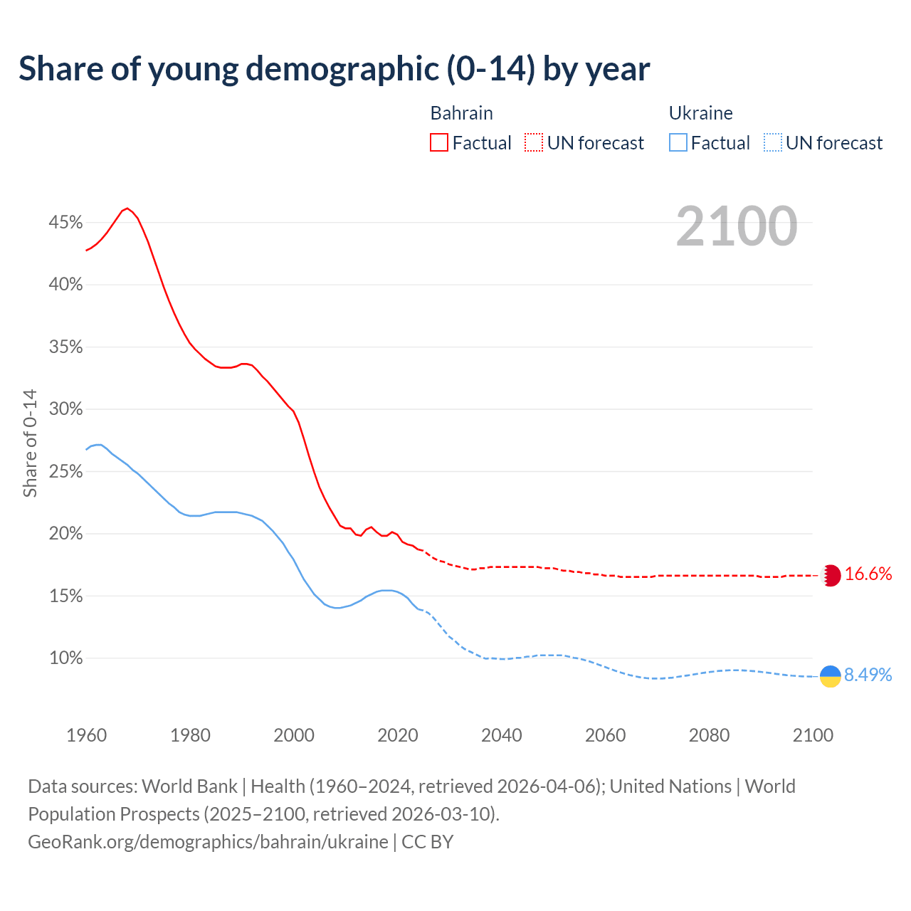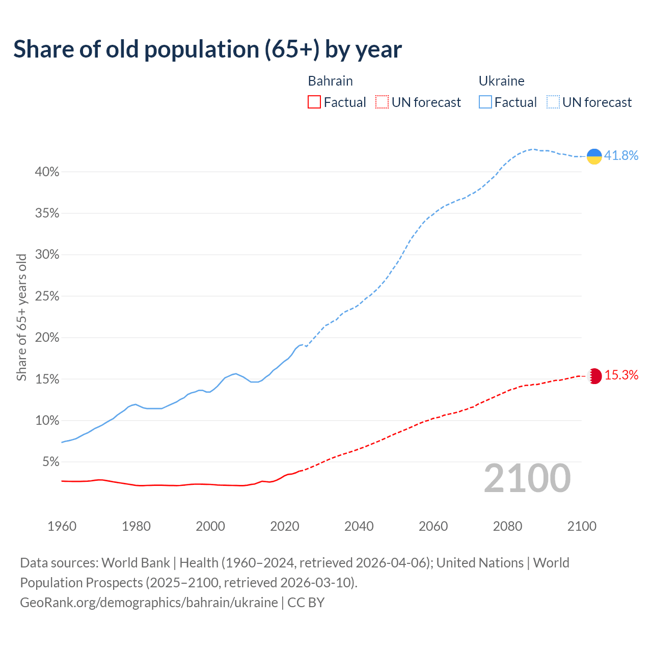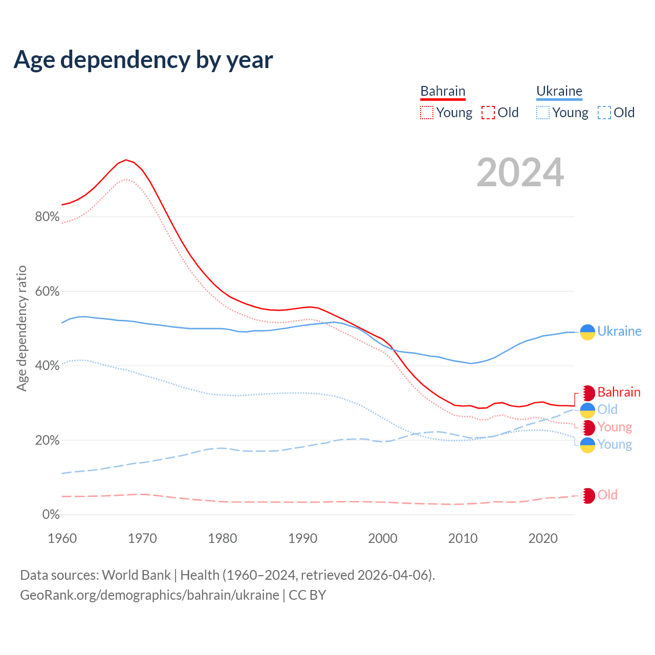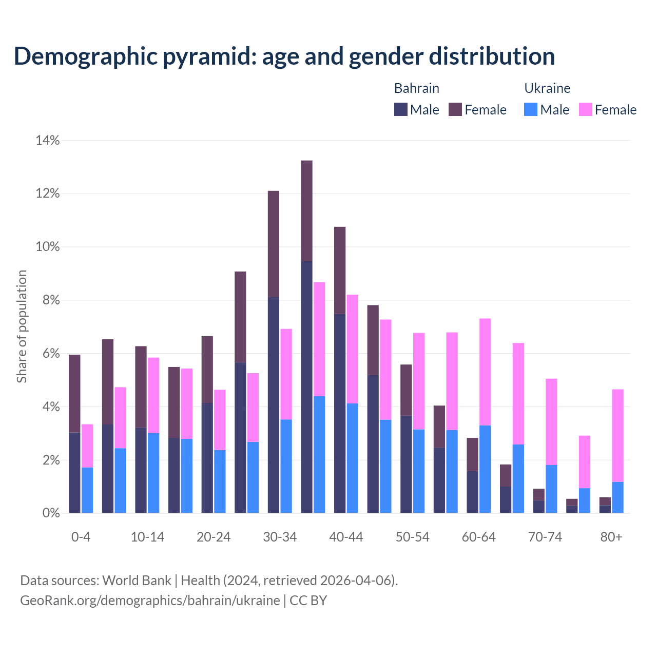 - Bahrain is ranked 80/196 by median age (oldest to youngest) vs 26/196 for Ukraine.