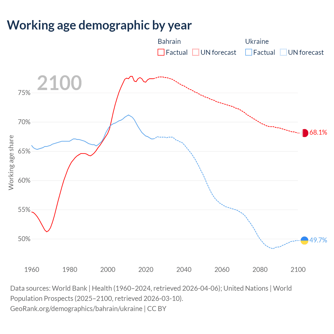 - Bahrain has 1.29M working age adults (aged 15-64) vs 26.9M in Ukraine.