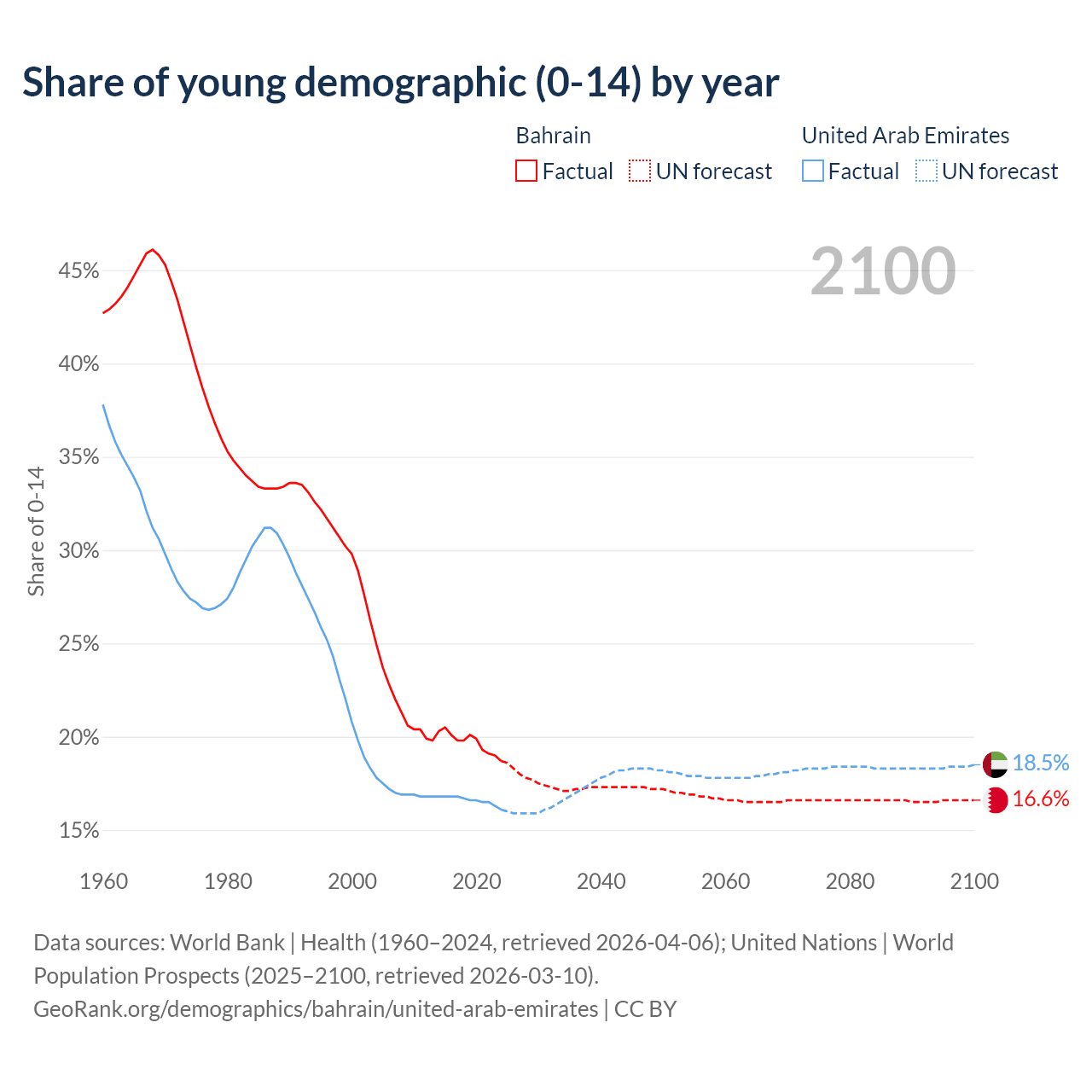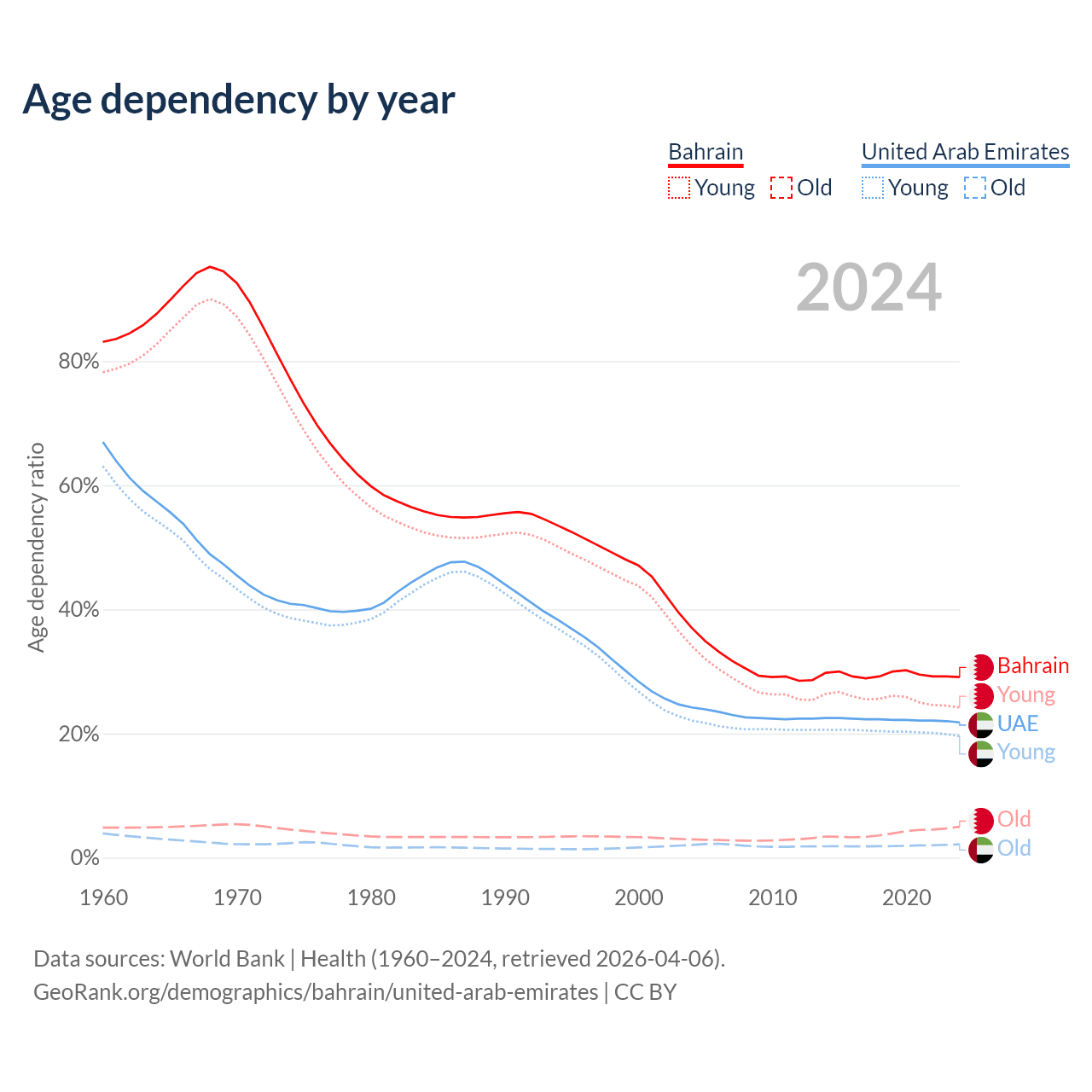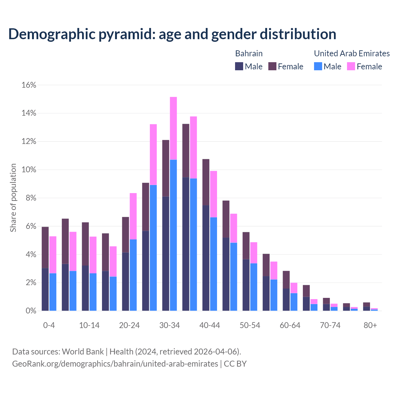 - Bahrain is ranked 80/196 by median age (oldest to youngest) vs 91/196 for the United Arab Emirates.
