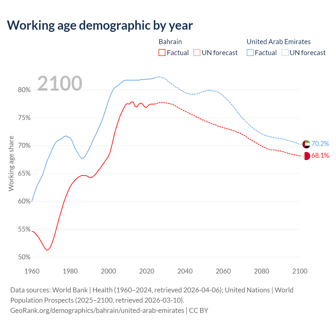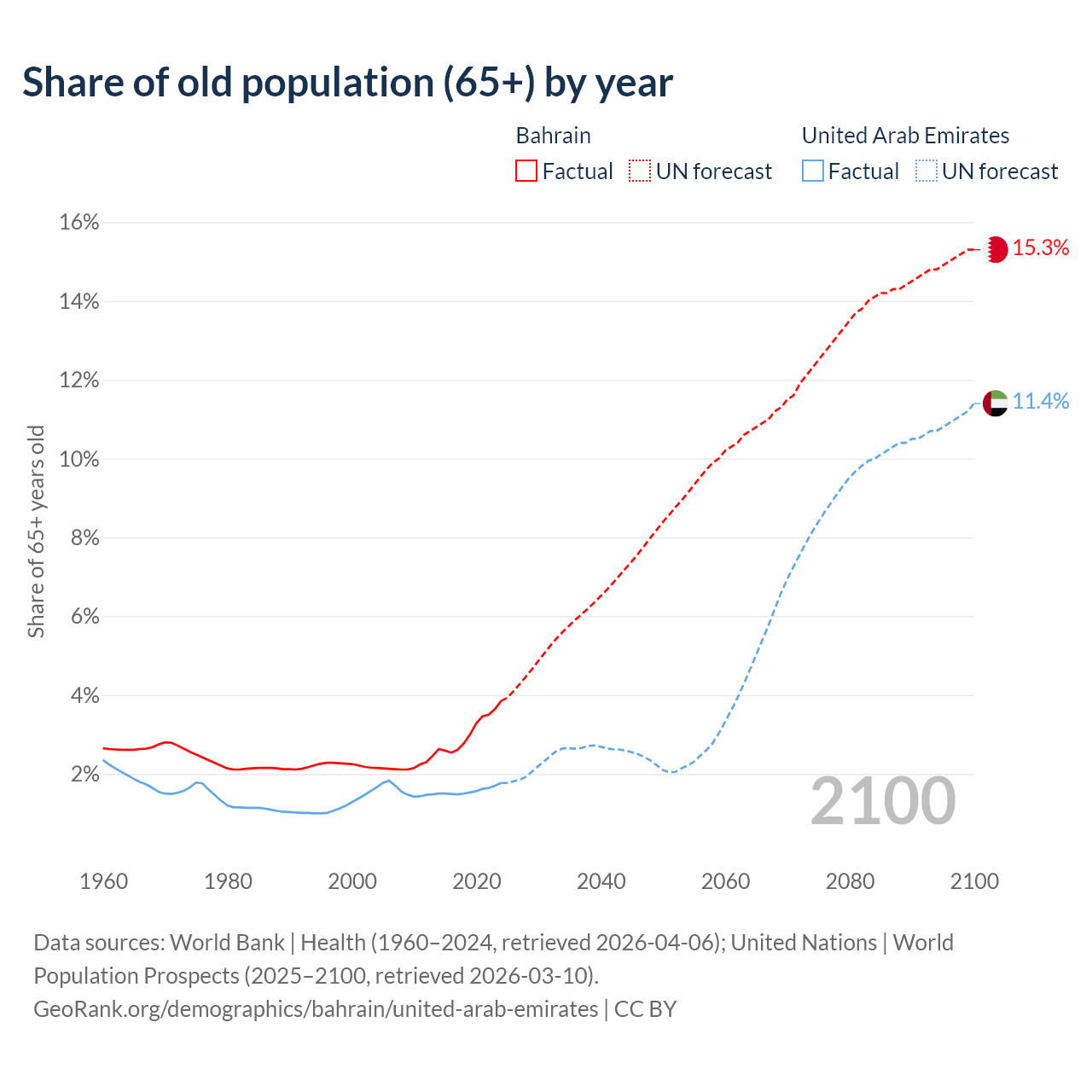 The share of older people aged 65 and over is 3.85% in Bahrain and 1.77% in the United Arab Emirates. Life expectancy in Bahrain compared to the United Arab Emirates .