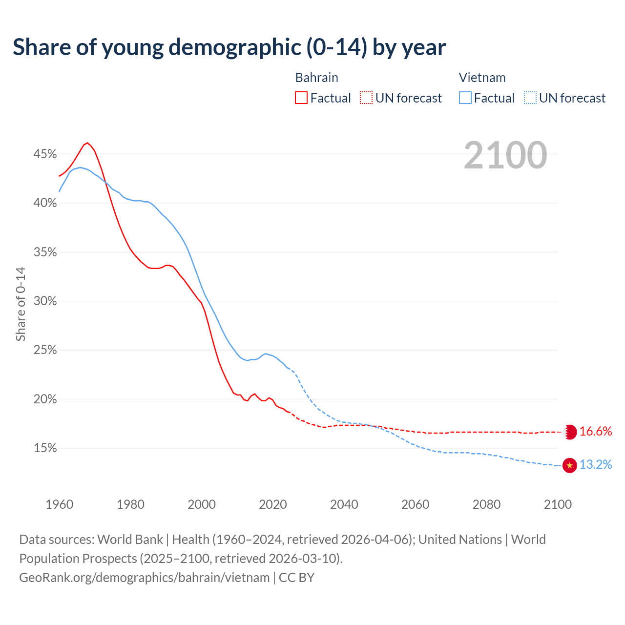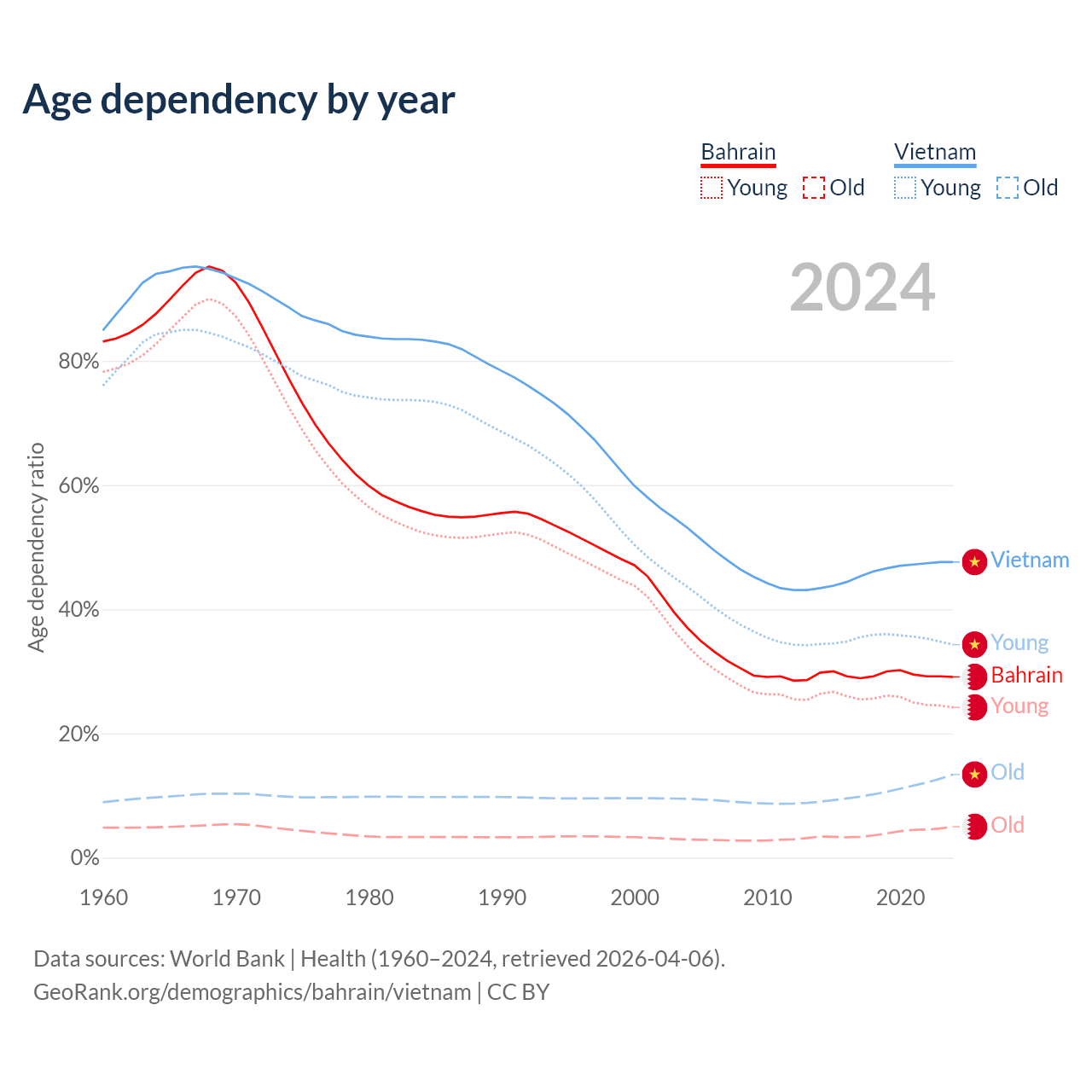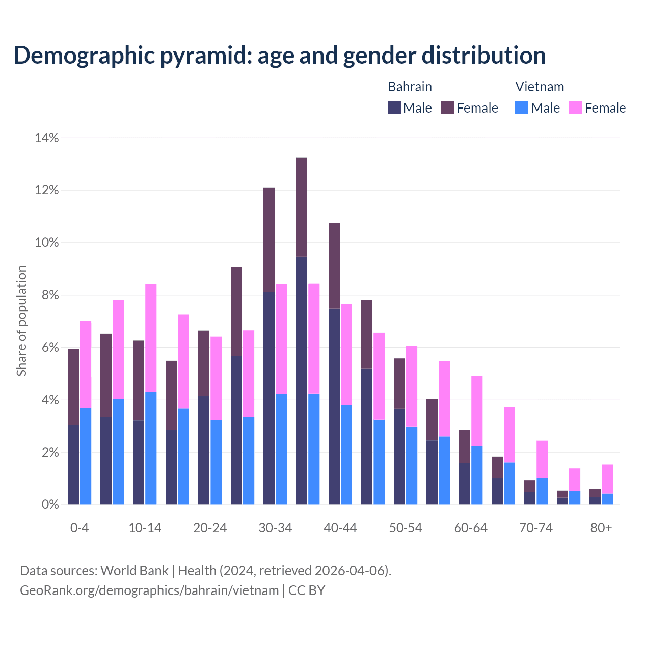 - Bahrain is ranked 80/196 by median age (oldest to youngest) vs 84/196 for Vietnam.