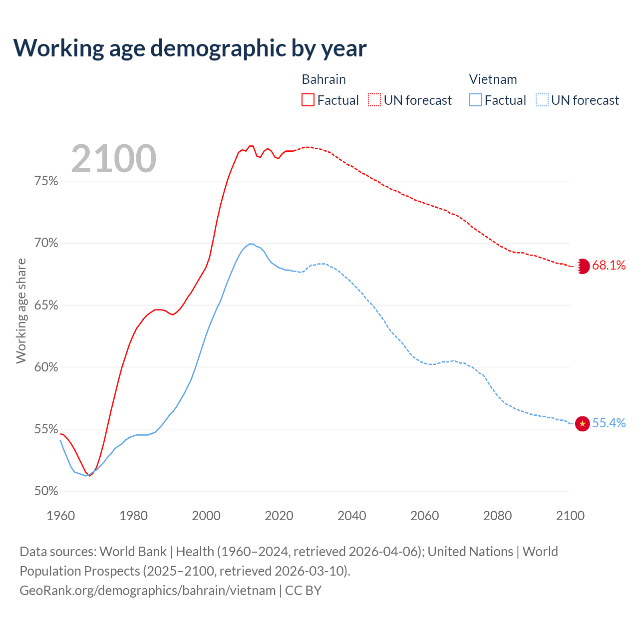 - Bahrain has 1.29M working age adults (aged 15-64) vs 69.3M in Vietnam.