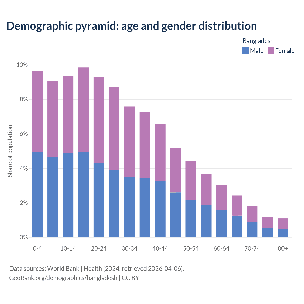 The share of older people aged 65 and over in Bangladesh increased from 3.66% to 6.5% between 2004 and 2024.