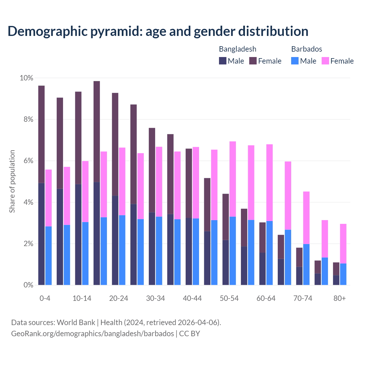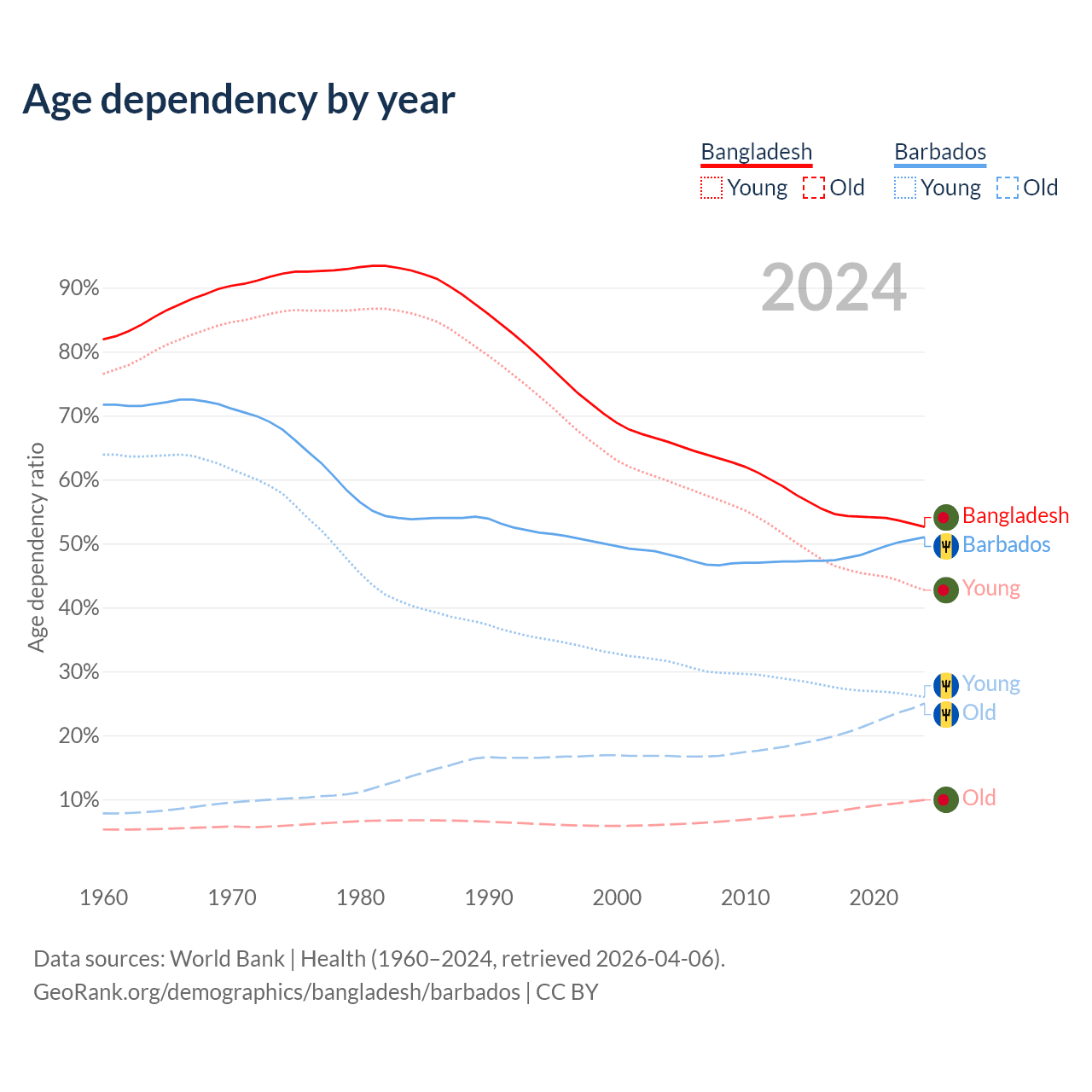 - Bangladesh is ranked 124/196 by median age (oldest to youngest) vs 47/196 for Barbados.