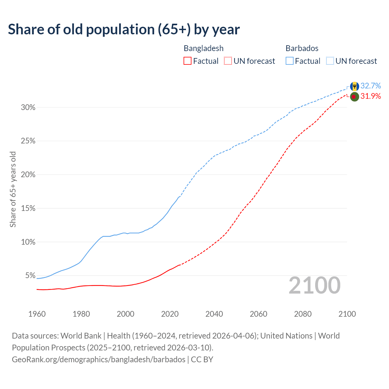 The share of older people aged 65 and over is 6.5% in Bangladesh and 16.6% in Barbados. Life expectancy in Bangladesh compared to Barbados .