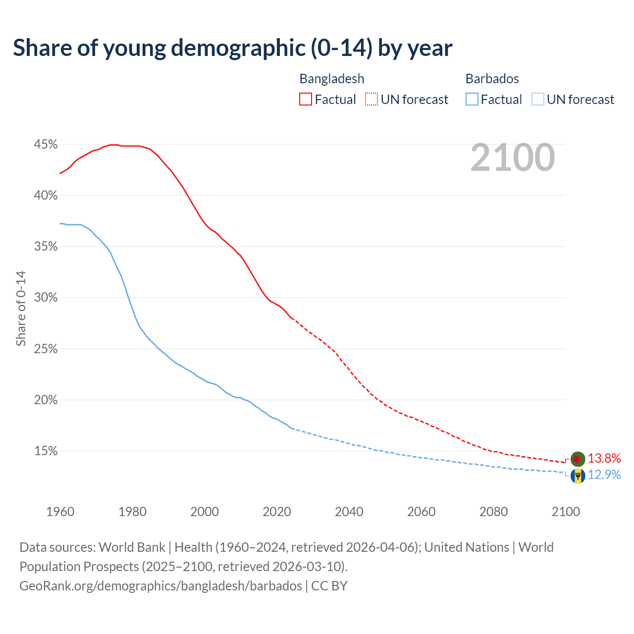 - The share of young demographic (0-15 years old) in Bangladesh is 28% vs 17.2% in Barbados.