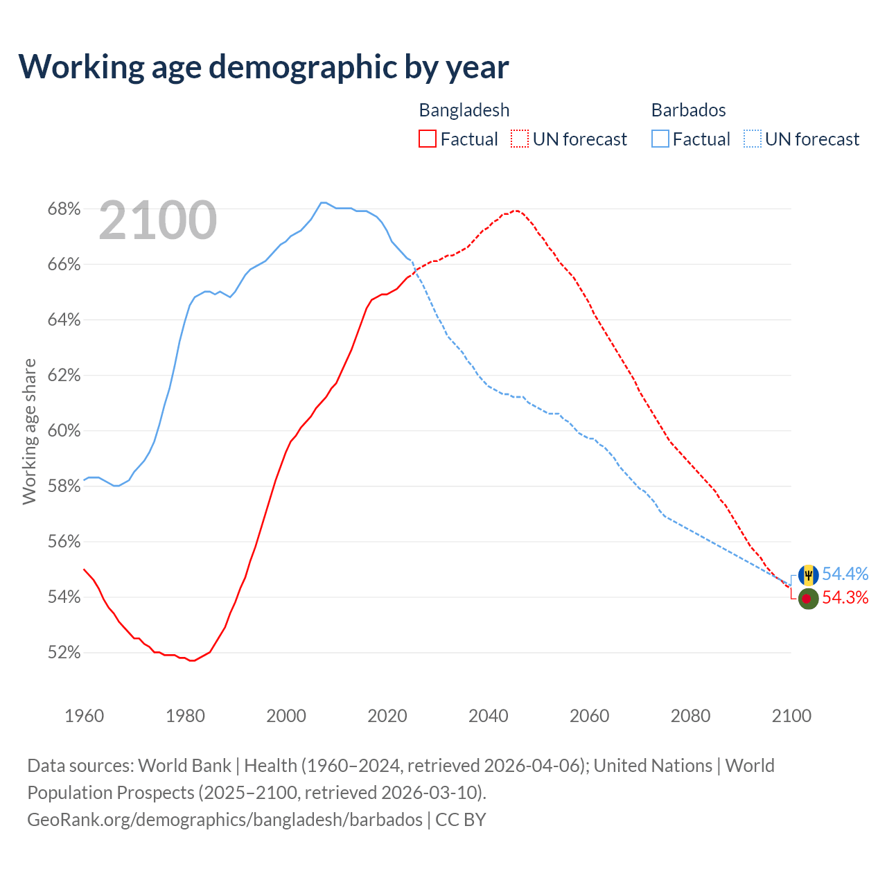 Median age Bangladesh vs Barbados, 1960-2100