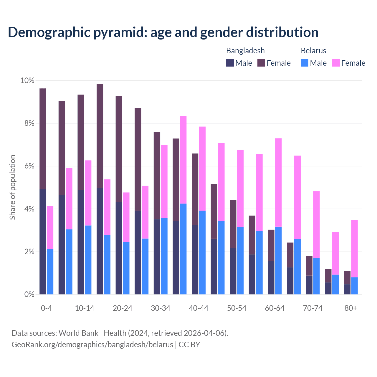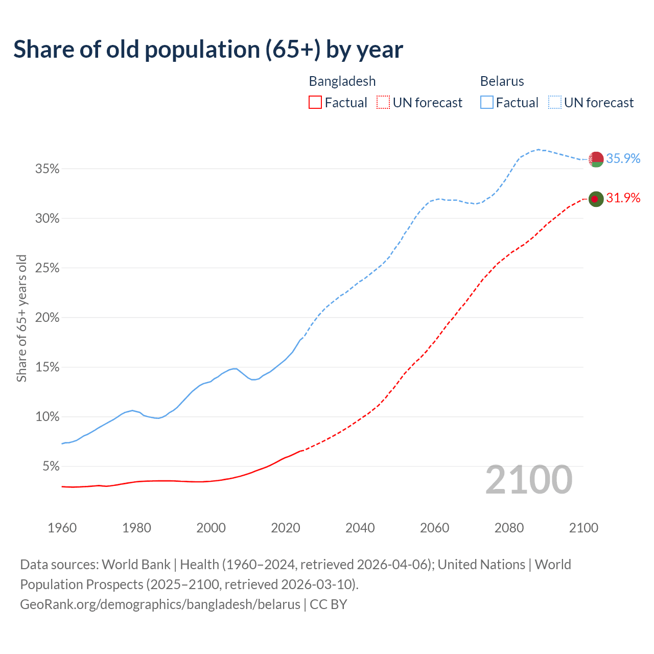 The share of older people aged 65 and over is 6.5% in Bangladesh and 17.7% in Belarus. Life expectancy in Bangladesh compared to Belarus .