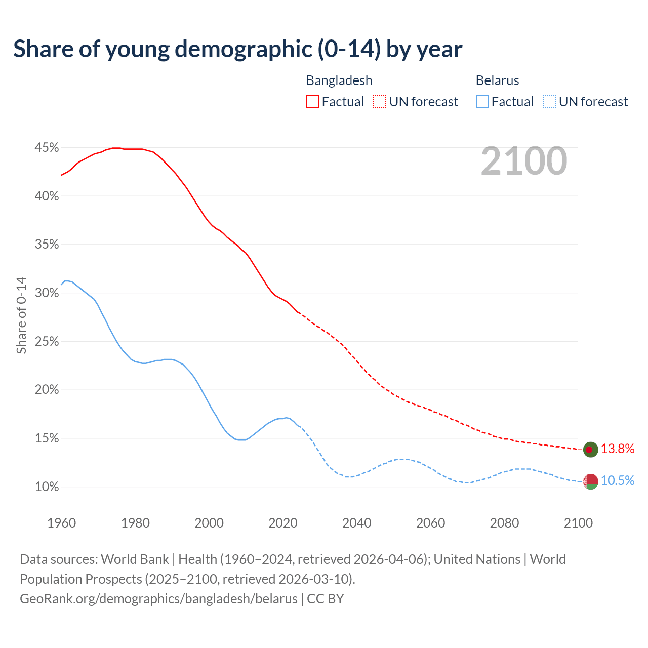 - The share of young demographic (0-15 years old) in Bangladesh is 28% vs 16.3% in Belarus.