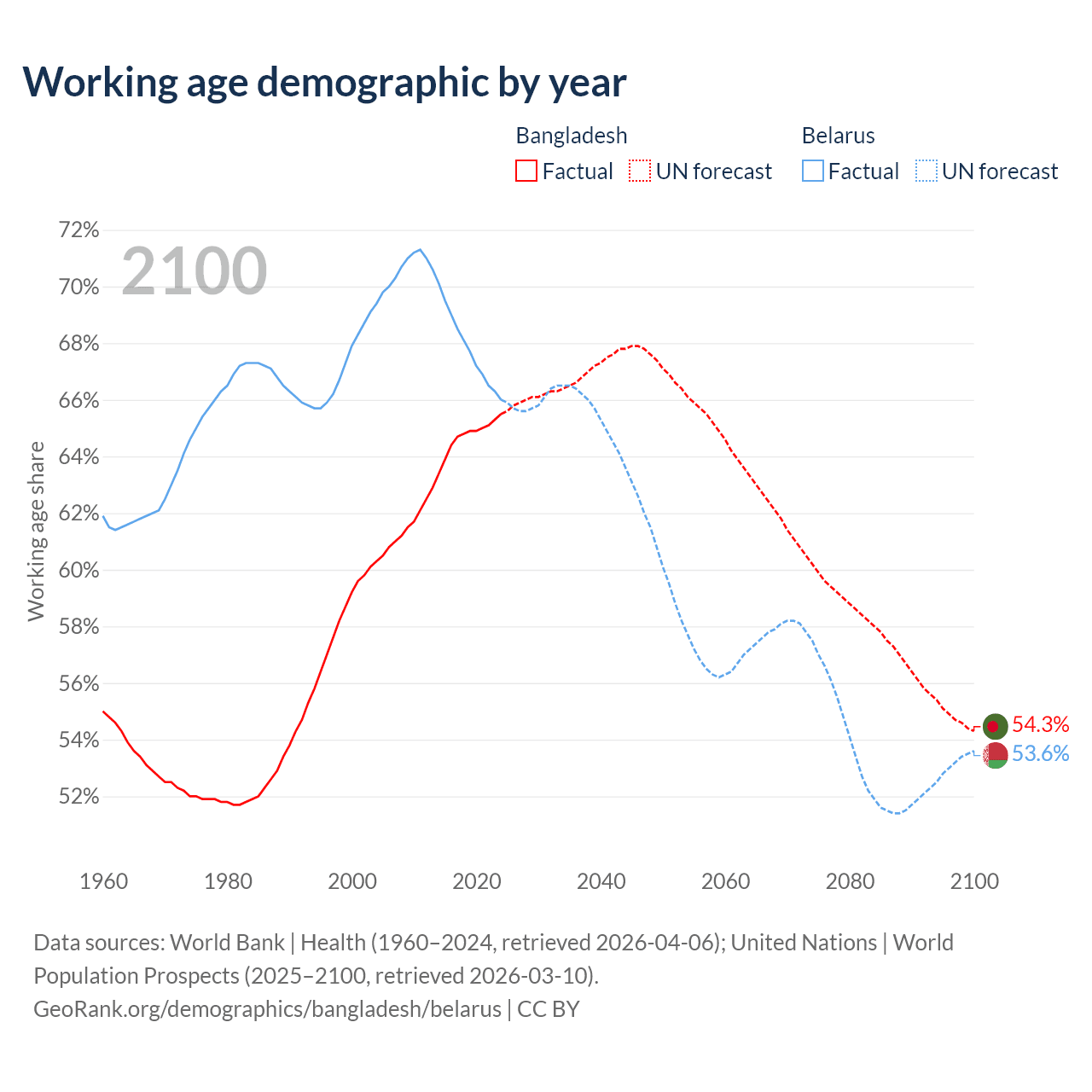 Median age Bangladesh vs Belarus, 1960-2100