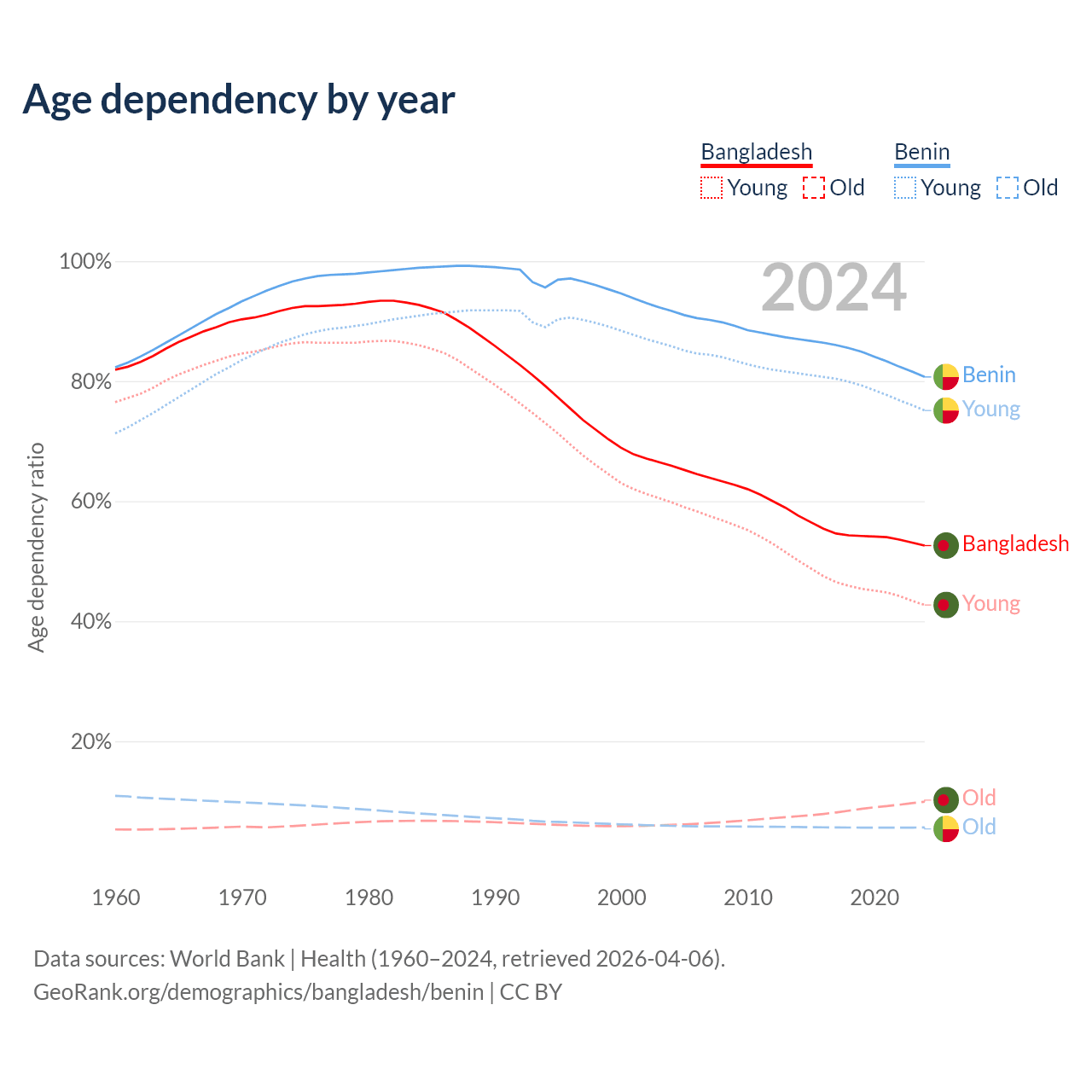 - Bangladesh is ranked 124/196 by median age (oldest to youngest) vs 179/196 for Benin.