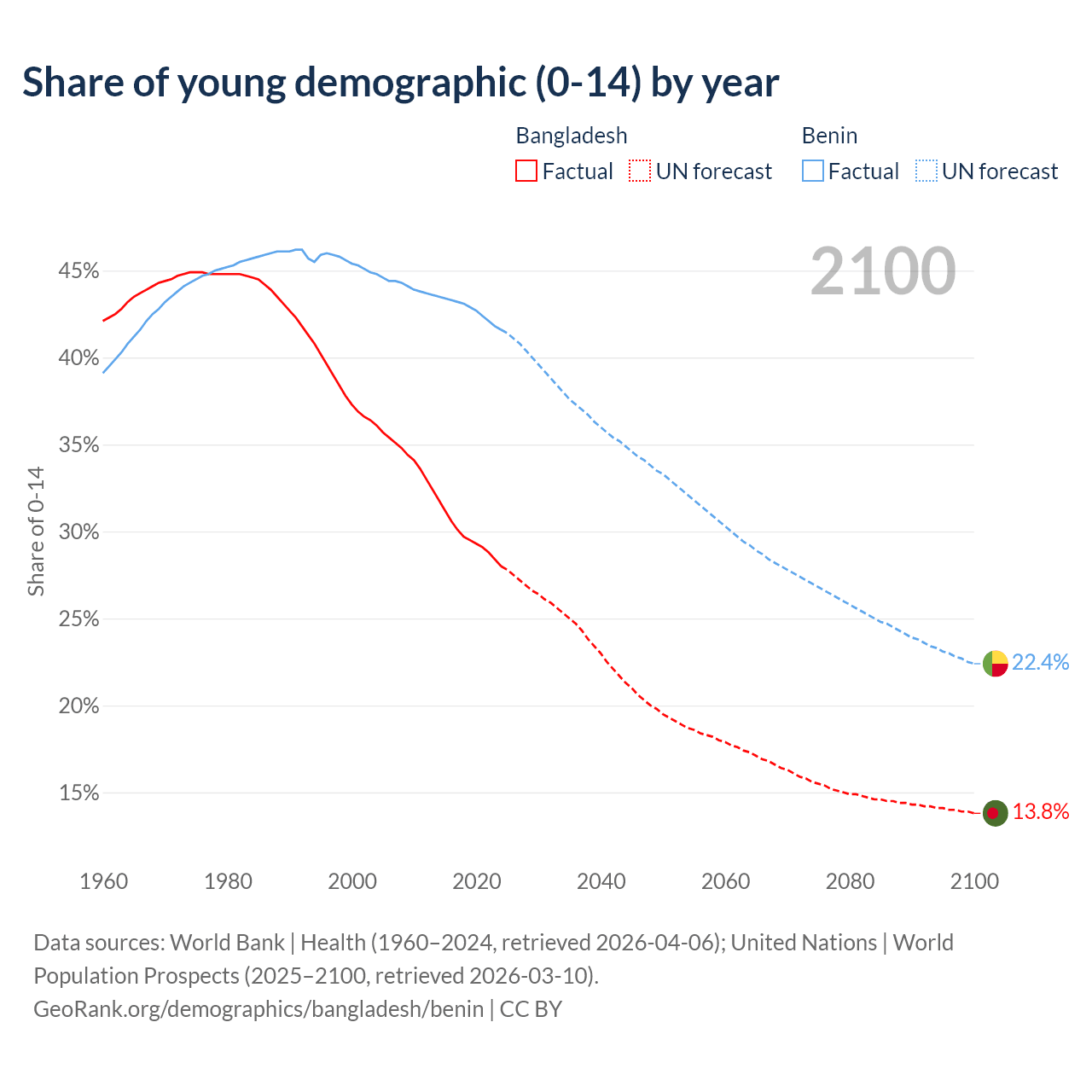 - The share of young demographic (0-15 years old) in Bangladesh is 28% vs 41.6% in Benin.