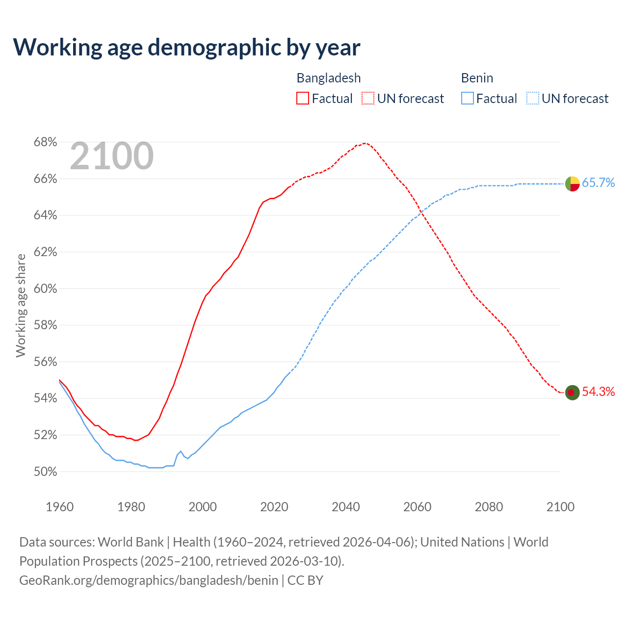 - Bangladesh has 117M working age adults (aged 15-64) vs 8.45M in Benin.