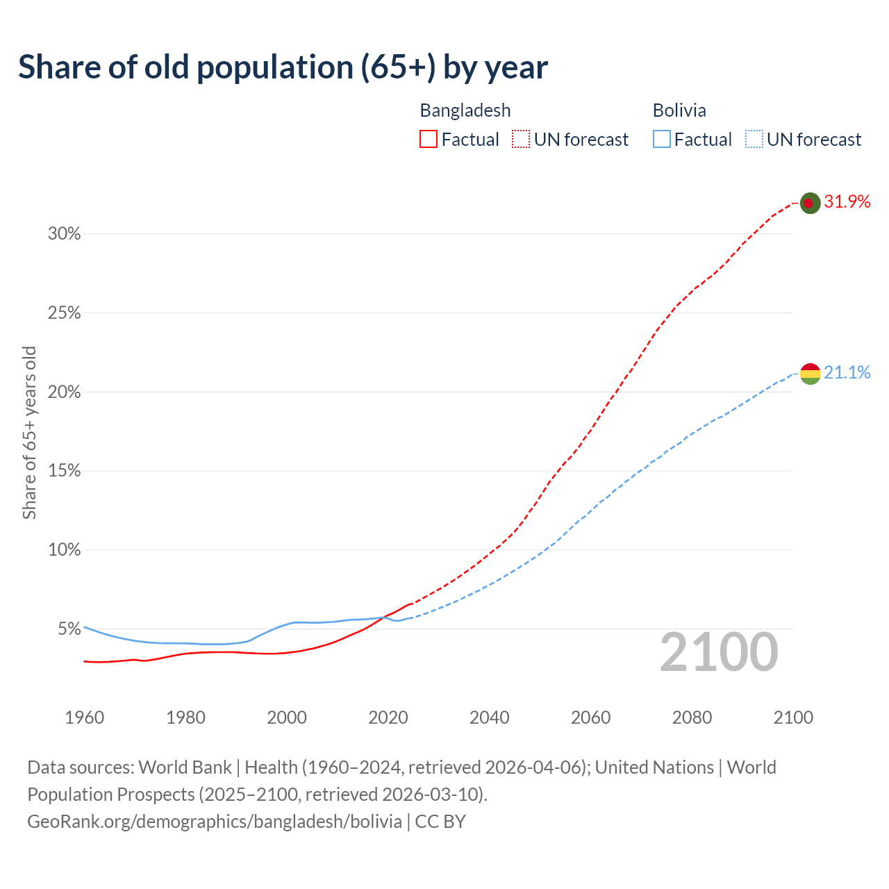The share of older people aged 65 and over is 6.5% in Bangladesh and 5.64% in Bolivia. Life expectancy in Bangladesh compared to Bolivia .