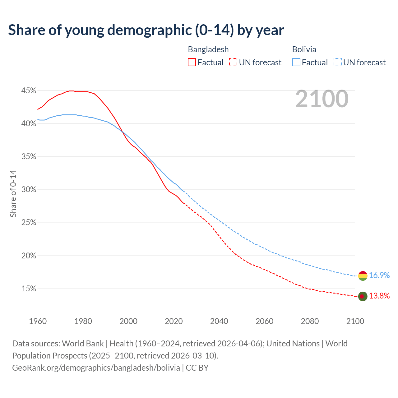 - The share of young demographic (0-15 years old) in Bangladesh is 28% vs 29.8% in Bolivia.