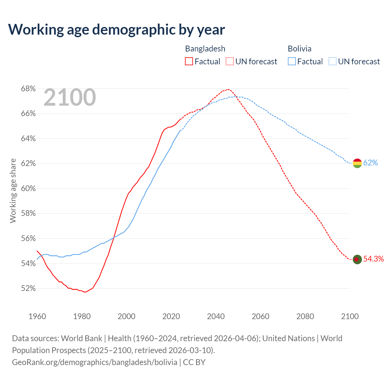 Median age Bangladesh vs Bolivia, 1960-2100