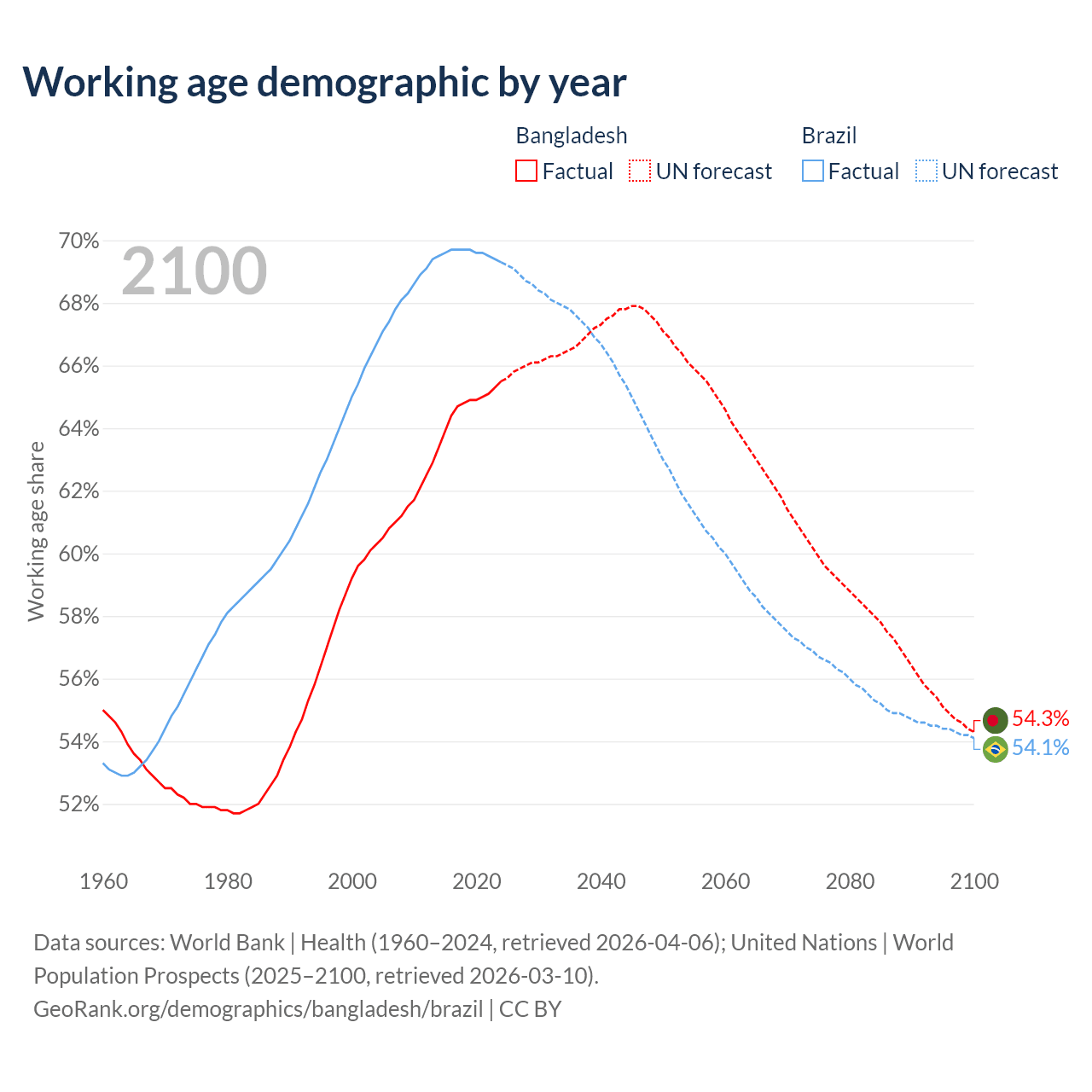 Median age Bangladesh vs Brazil, 1960-2100