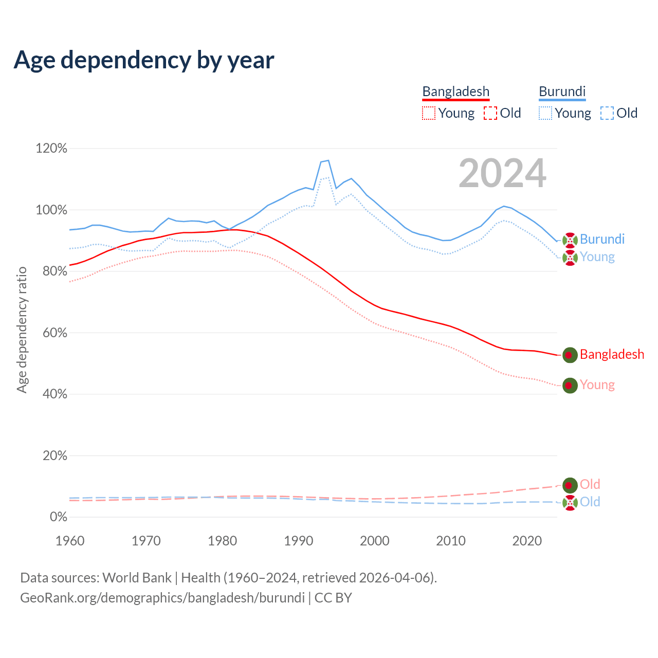 The share of older people aged 65 and over is 6.5% in Bangladesh and 2.53% in Burundi. Life expectancy in Bangladesh compared to Burundi .