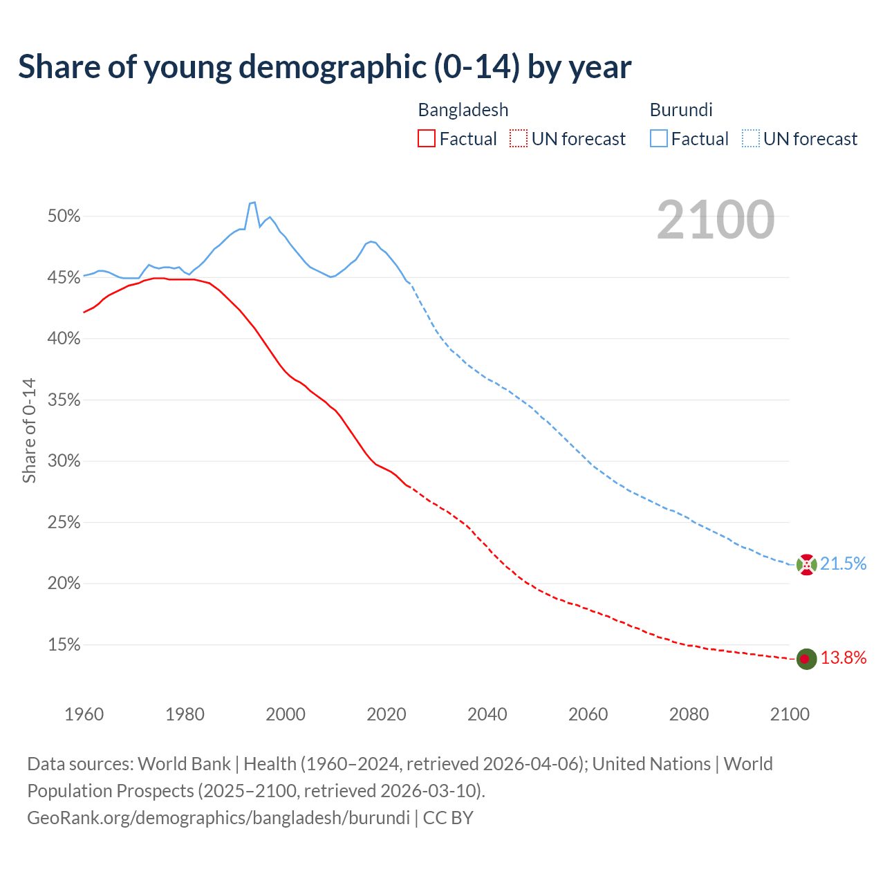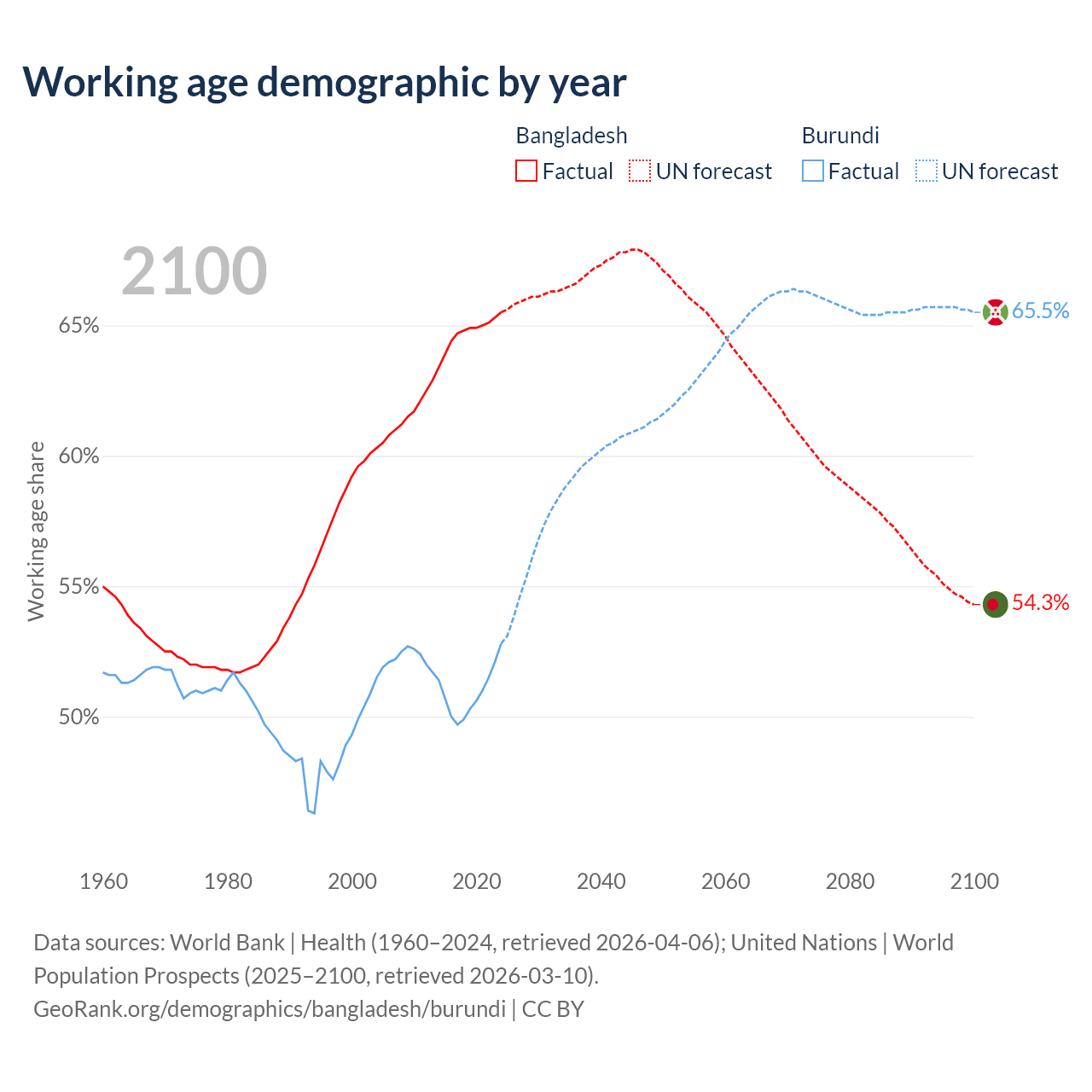 Median age Bangladesh vs Burundi, 1960-2100