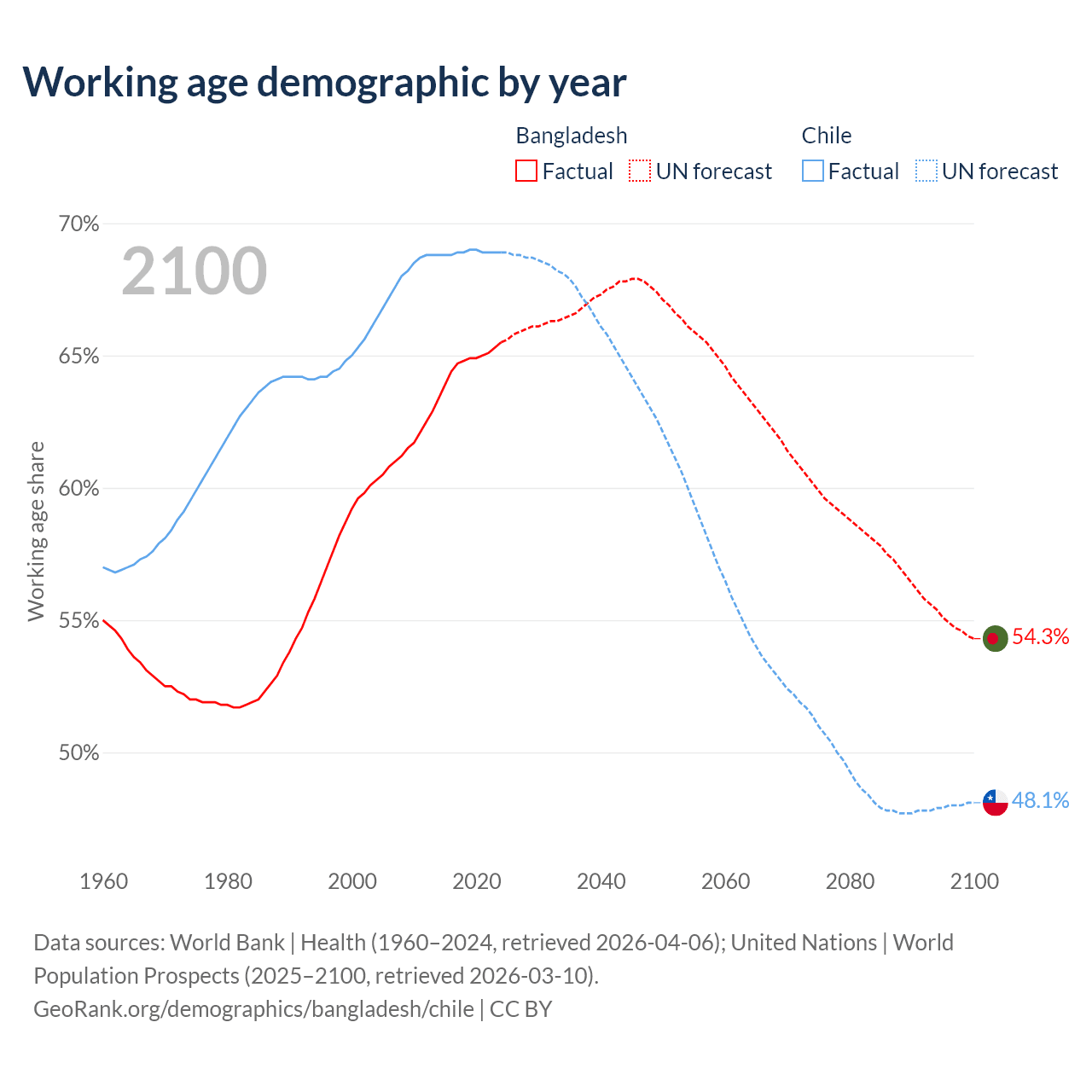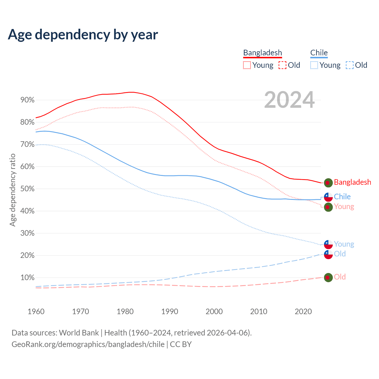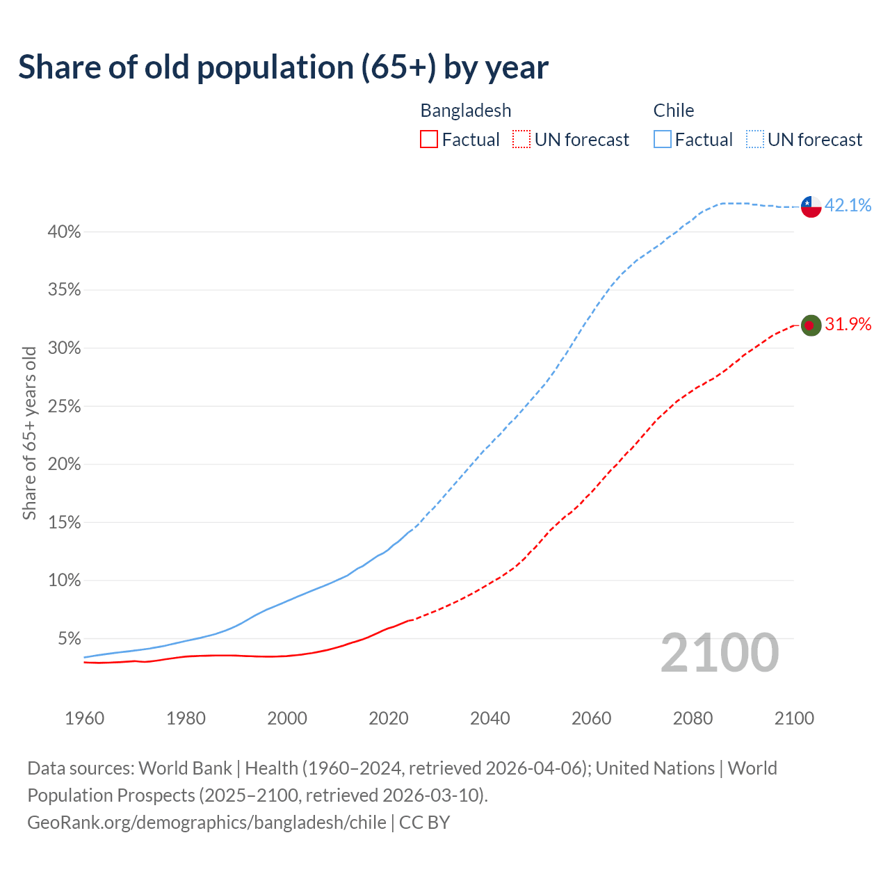 The share of older people aged 65 and over is 6.5% in Bangladesh and 14.1% in Chile. Life expectancy in Bangladesh compared to Chile .