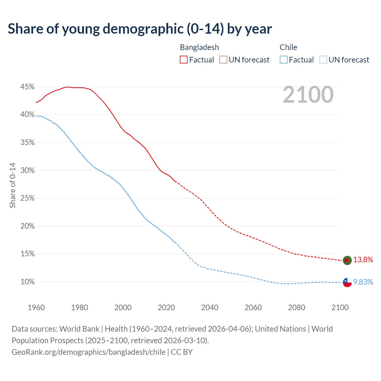 - The share of young demographic (0-15 years old) in Bangladesh is 28% vs 17% in Chile.