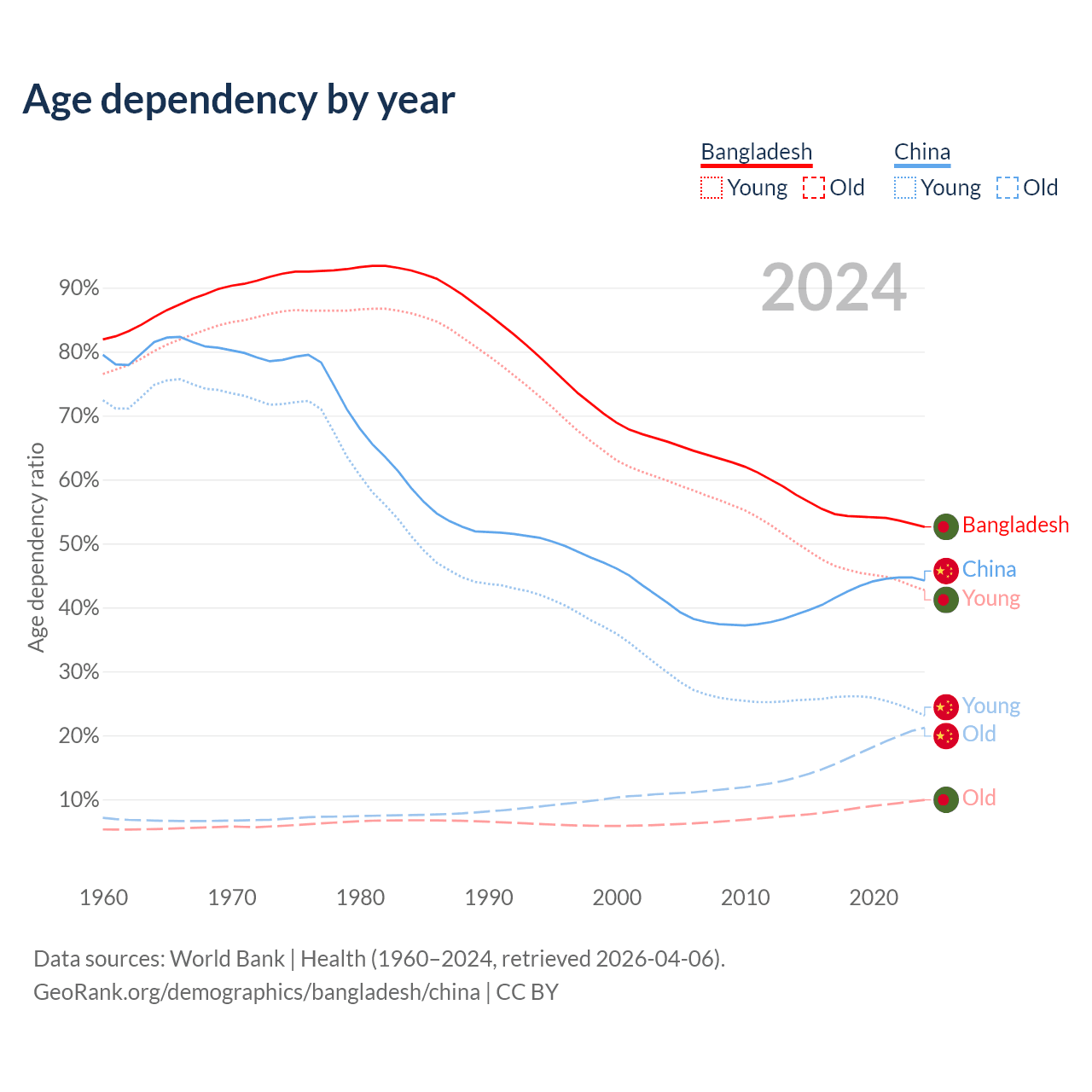 - Bangladesh is ranked 124/196 by median age (oldest to youngest) vs 44/196 for China.