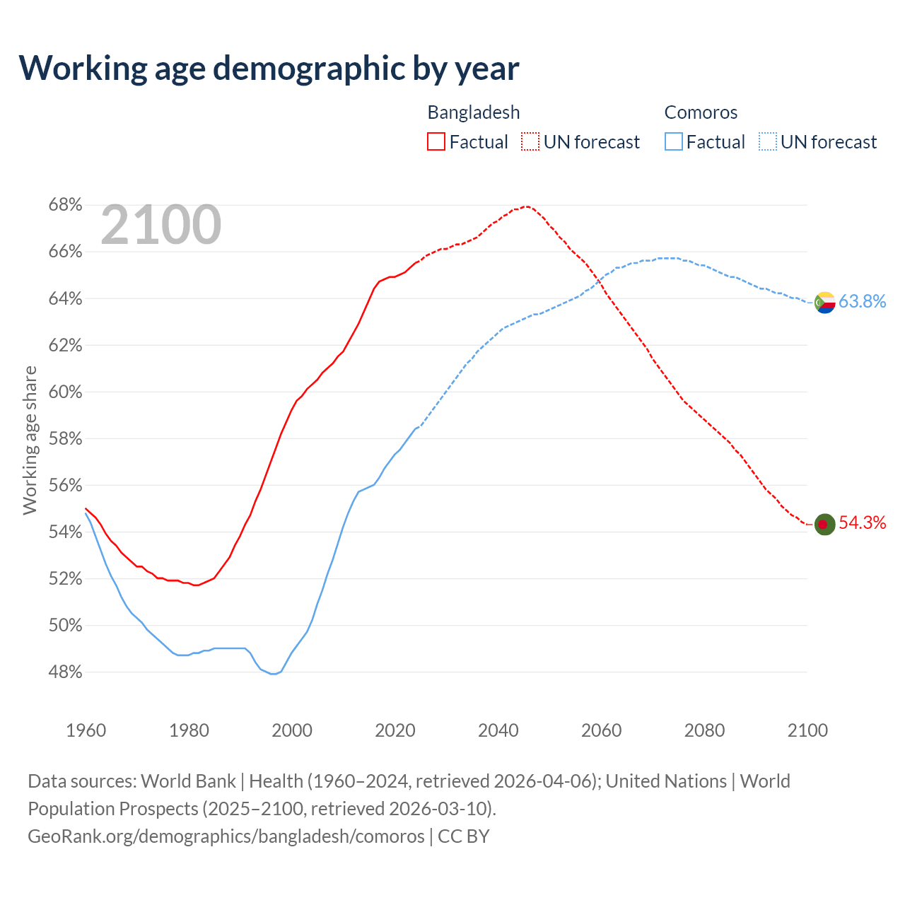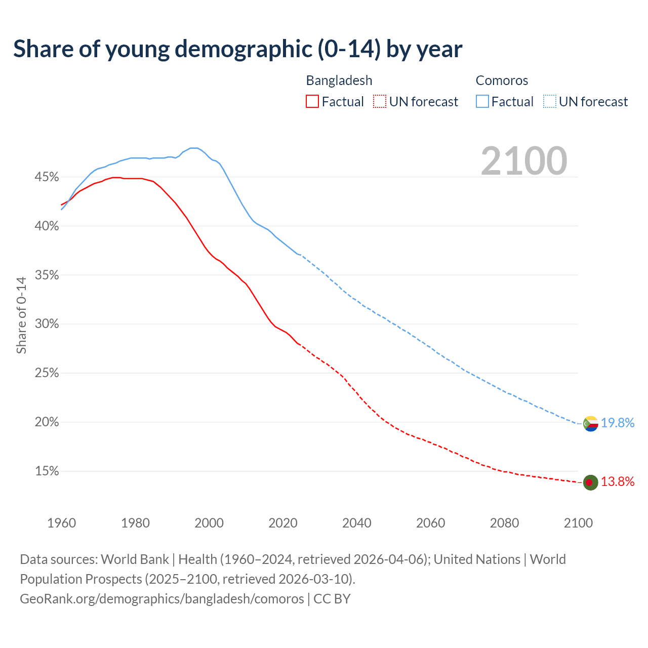 - The share of young demographic (0-15 years old) in Bangladesh is 28% vs 37.1% in Comoros.